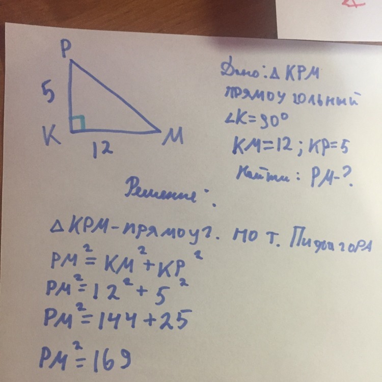 в треугольнике крм угол к равен 90° . Сторона км=12 см , сторона кр=5см . найдите длину стороны рм