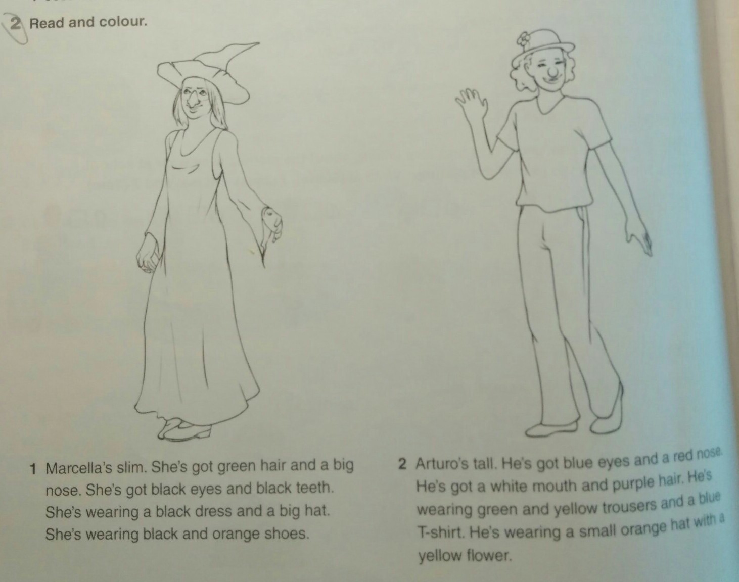 Марсела худая.У неё зелёные волосы и большой нос.У неё чёрные глаза и чёрные зубы.Она носит чёрное платье и большую шляпу.На неё надеты чёрные и оранжевые туфли. Артур высокий.У него голубые глаза и красный нос.У него белый рот и фиолетовые волосы.На него надеты зелёные и жёлтые брюки и голубая футболка.Он носит маленькую оранжевую шляпку с жёлтым цветком