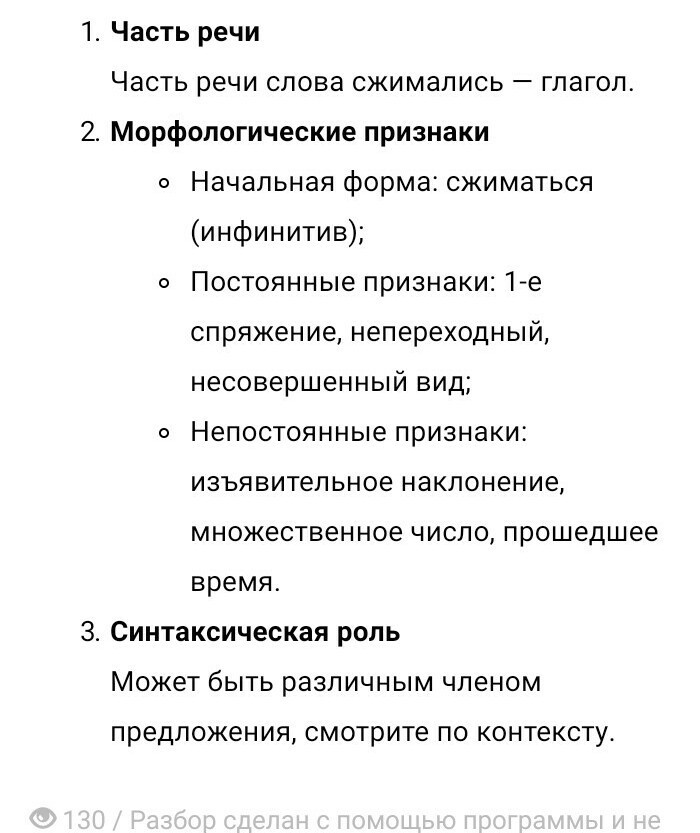 I. Н.ф. - сжиматься. Пост. - несов.в., возвр, неперех., 1 спр.; непост. - изъяв. накл., прош. время, 3 л.