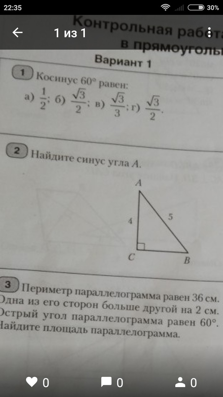 Синус угла А = CB/AB(отношение противолежащего катета к гипотенузе)