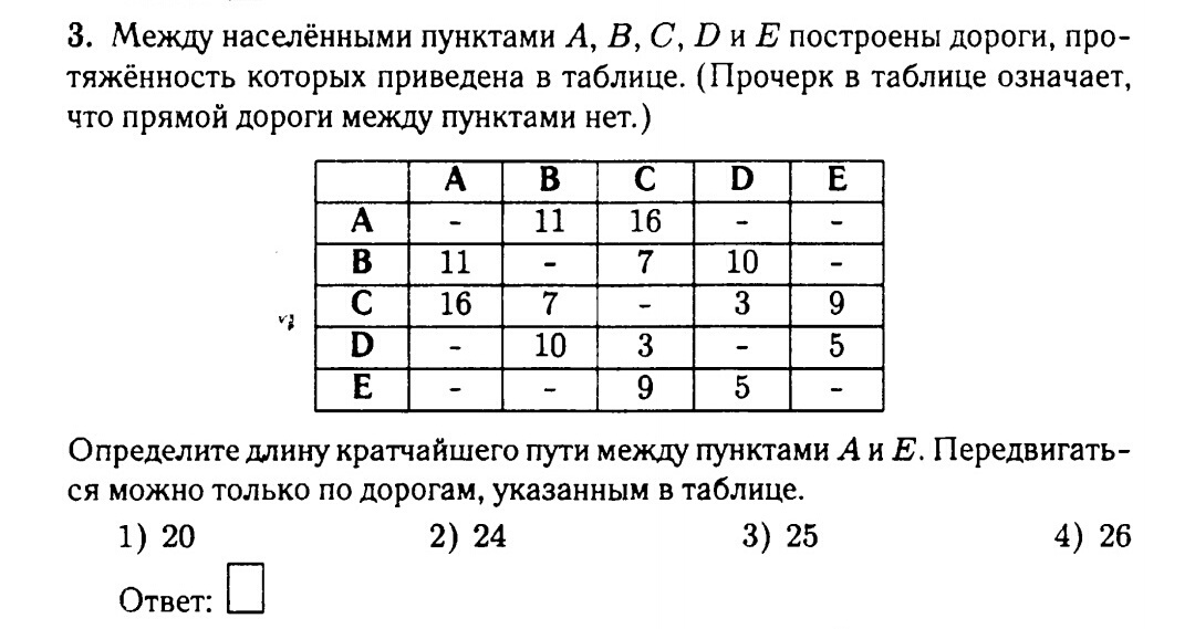 между населенными пунктами А,В,С,Д и Е Построены дороги, протяженност которых приведена в таблице (прочерк в табл означает что прямой дороги нет )