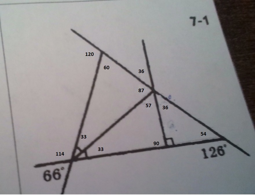 спс но ты не нашёл ещё 1 угол где 66 гр там справа и ещё 1 угол где 87 там противоположный сколько градусов?