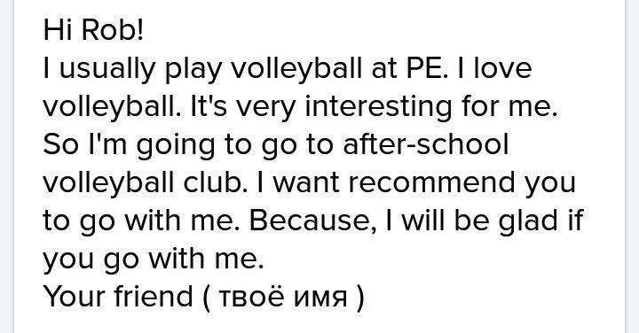 Роб - ваш друг-друг. Ответьте на письмо Роба. Расскажите ему о спорте в своем классе. Подумайте об этих вопросах: В каких спортивных состязаниях вы участвуете в школе, в какие школы после школы вы идете? Какие спортивные клубы вы можете посоветовать Робу попробовать в своей школе? Зачем?