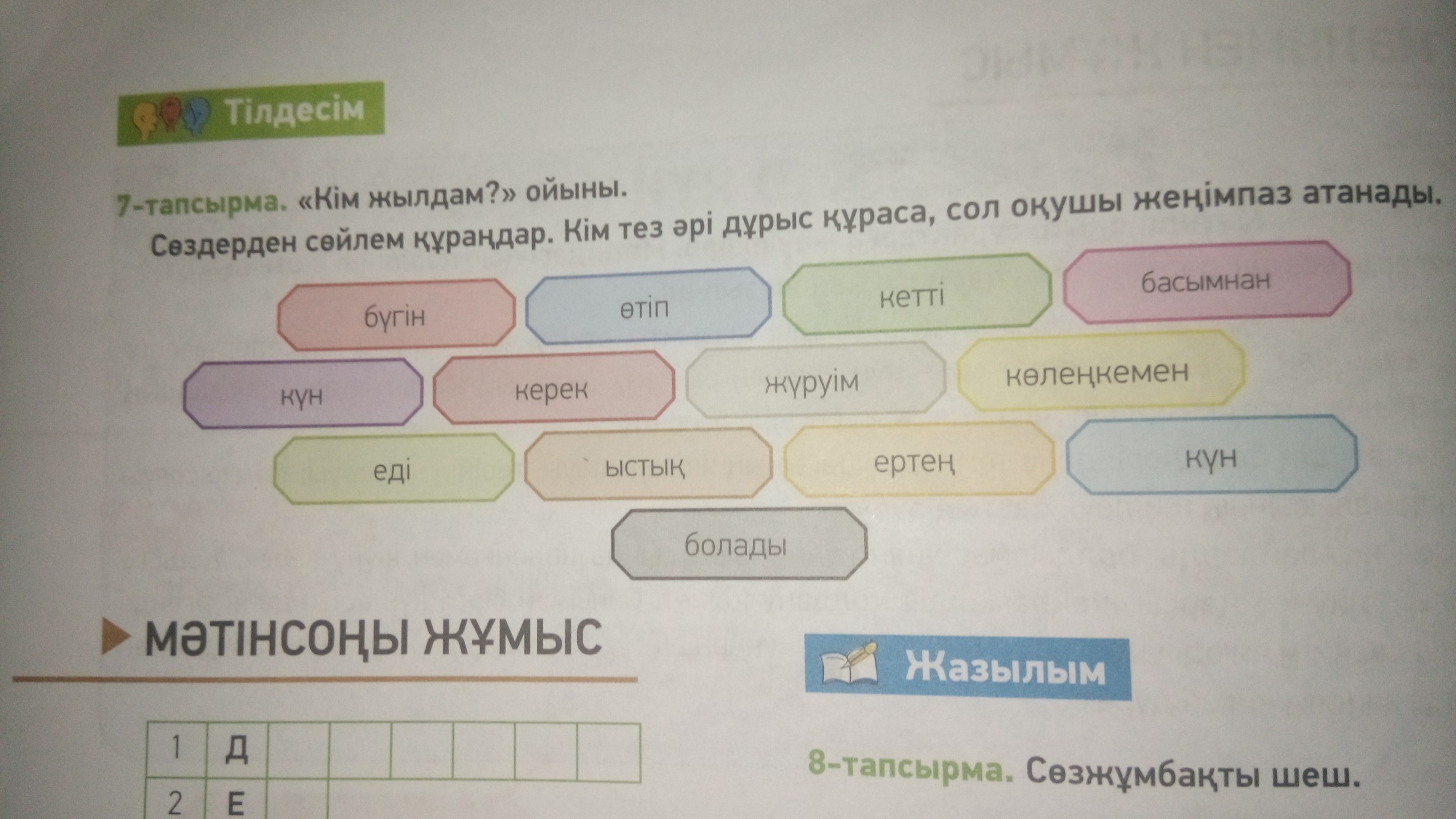 Бүгін мен мектепке бардым.Бүгін мен қаладан өтіп ауылға бардым.Менің таза жүруім маңызды.Менің досым үйіне кетті.Кеше болған оқиға бүгін менің басымнан өтті.Бүгінгі күн жарық екен.Сабақ орындауым керек.Сен мені көлеңкемен жауып тұрсың.Кеше сағатқа қарағанда 10 еді.Мені ауылда ыстық ықыласпен қарсалды.Ертең мен спортқа барамын.Досым күн жақсы өтсін.Ертең 4 сабақ болады.