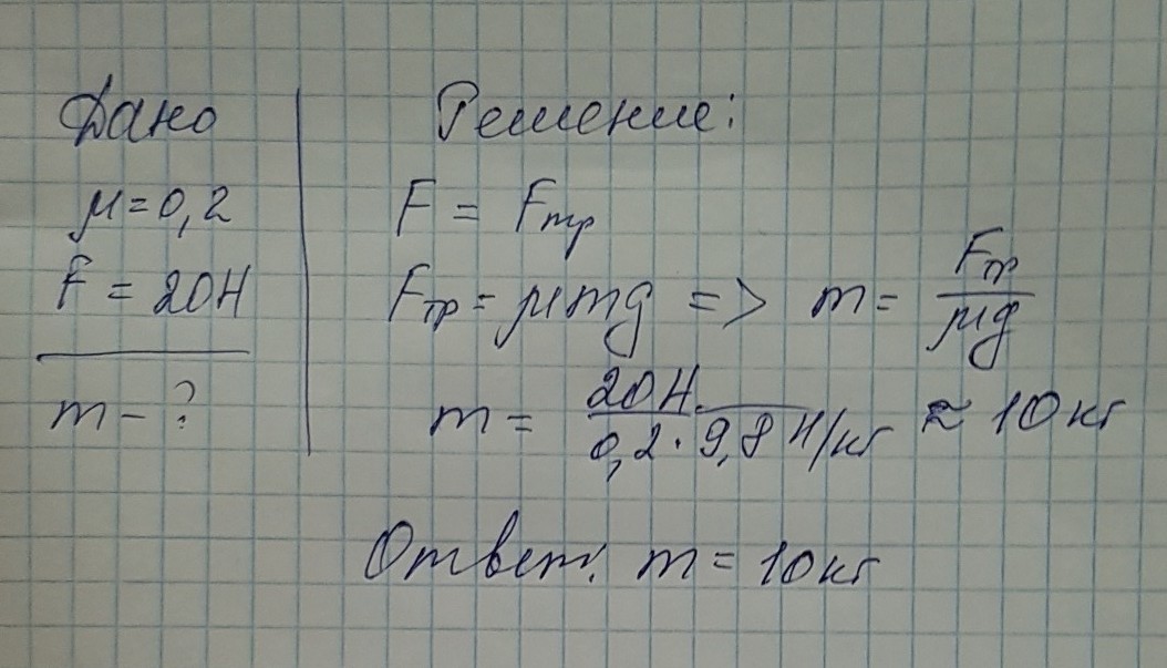 Ящик стоит на полу. Коэффициент трения между ящиком и полом 0,2. Какова масса ящика, если его можно сдвинуть с места минимальной силой равной 20Н, направленной горизонтально?