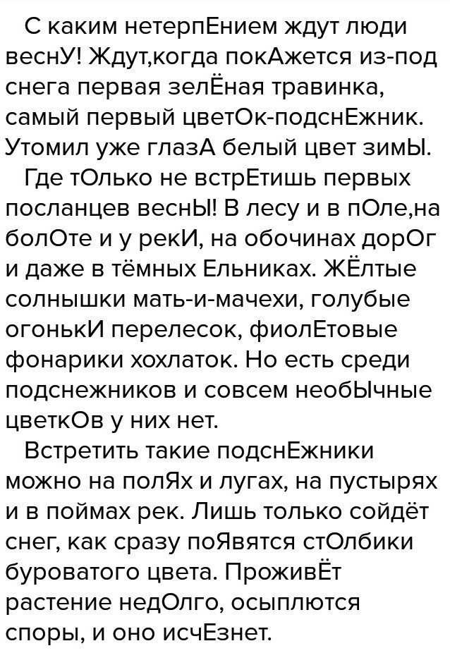 Где тОлько не встрЕтишь первых посланцев веснЫ! В лесу и в пОле,на болОте и у рекИ, на обочинах дорОг и даже в тёмных Ельниках. ЖЁлтые солнышки мать-и-мачехи, голубые огонькИ перелесок, фиолЕтовые фонарики хохлаток. Но есть среди подснежников и совсем необЫчные цветкОв у них нет.