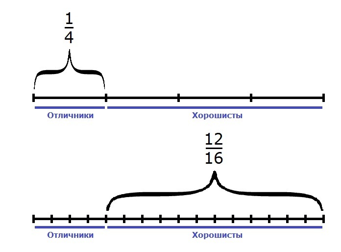 В классе 16 школьников. Из них 1/4 составляют отличники, 12/16 составляет хорошисты. Сколько отличников и хорошистов в классе? Сделать графическое описание задачи.