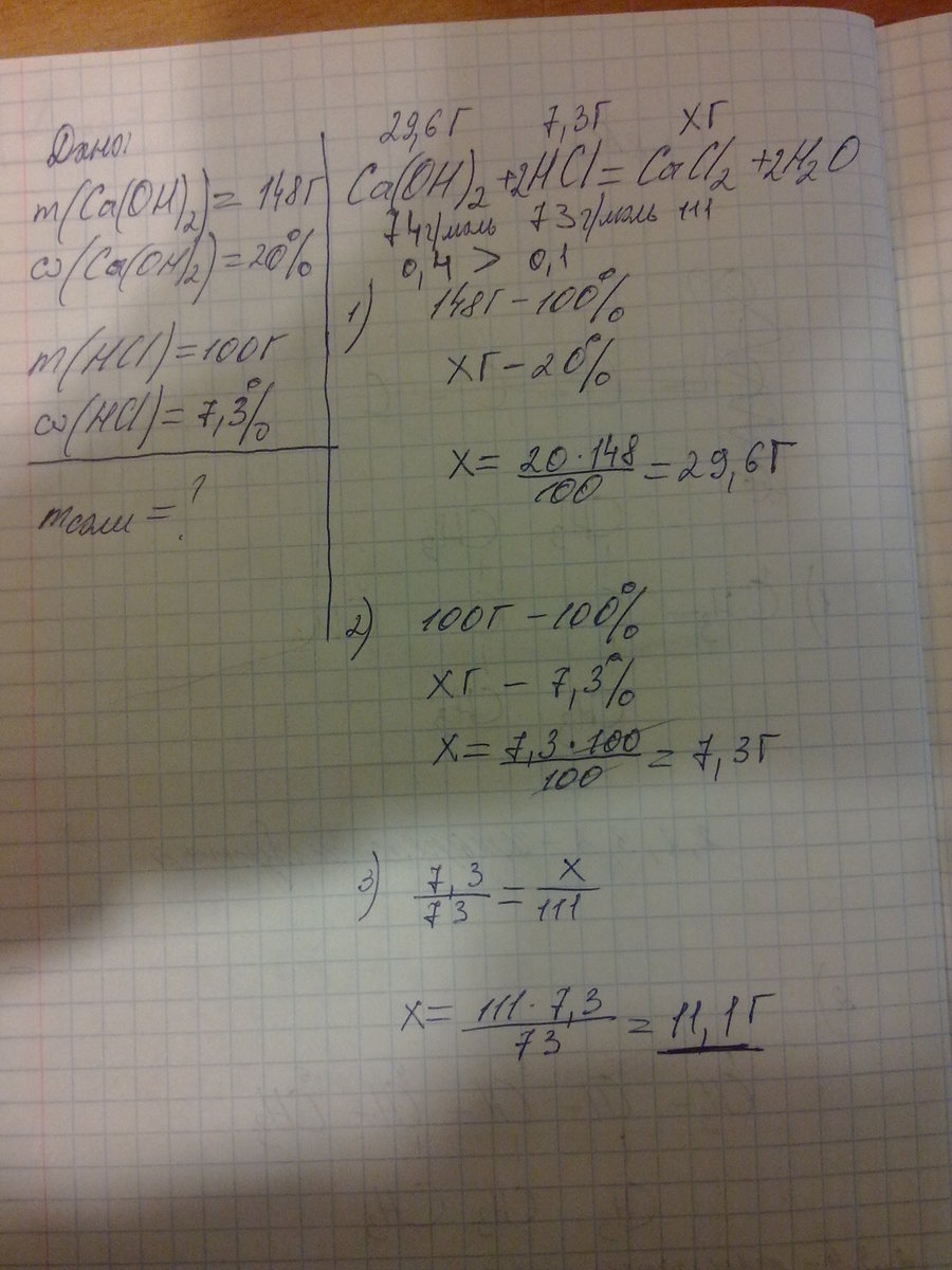 Найти массу соли, которая получится при взаимодействии 148 г 20% -ного раствора гидроксида кальция и 100 г 7,3 % - ного раствора соляной кислоты.