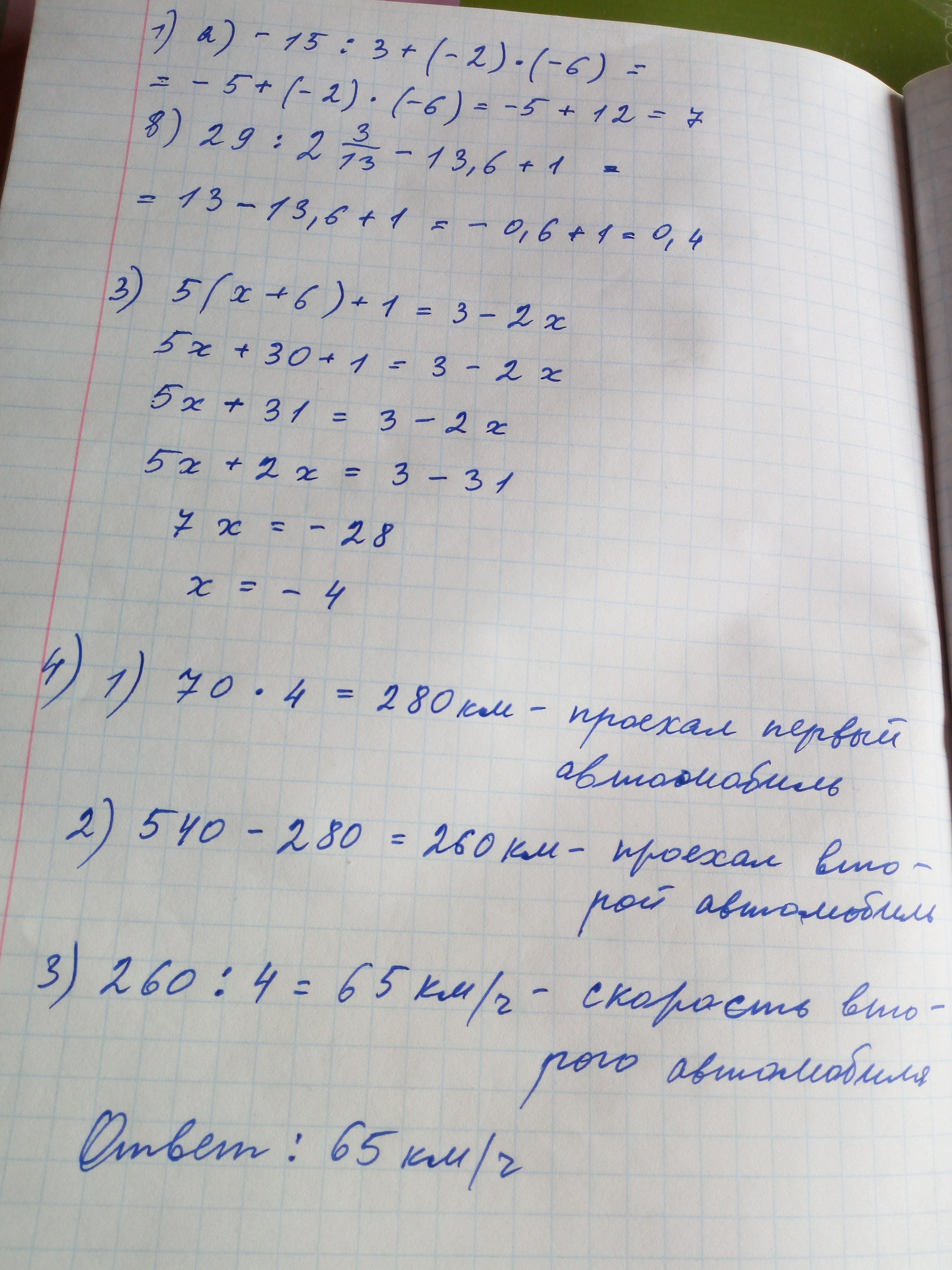 4. Из двух городов, расстояние между которыми равно 540 км, навстречу друг другу одновременно выехали два автомобиля. Найдите скорость второго автомобиля, если скорость первого равна 70 км/ч и автомобили встретились через 4 часа после выезда.