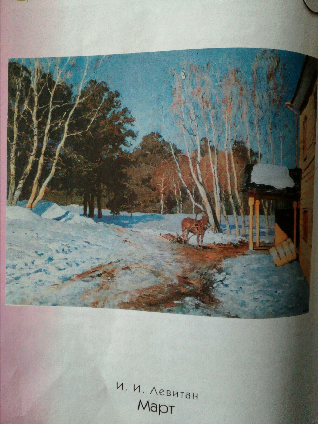 я живу в небольшом домике. У меня есть лошадь на санях. И скоро будет март.Я поехал рубить дрова.После рубки дров я поехал домой топить печку.Потом я лёг спасть. Утром таял снег и начался май.Я смотрел за это красотой.И пошёл дальше рубить дрова для печки. Март И. И. Левитан