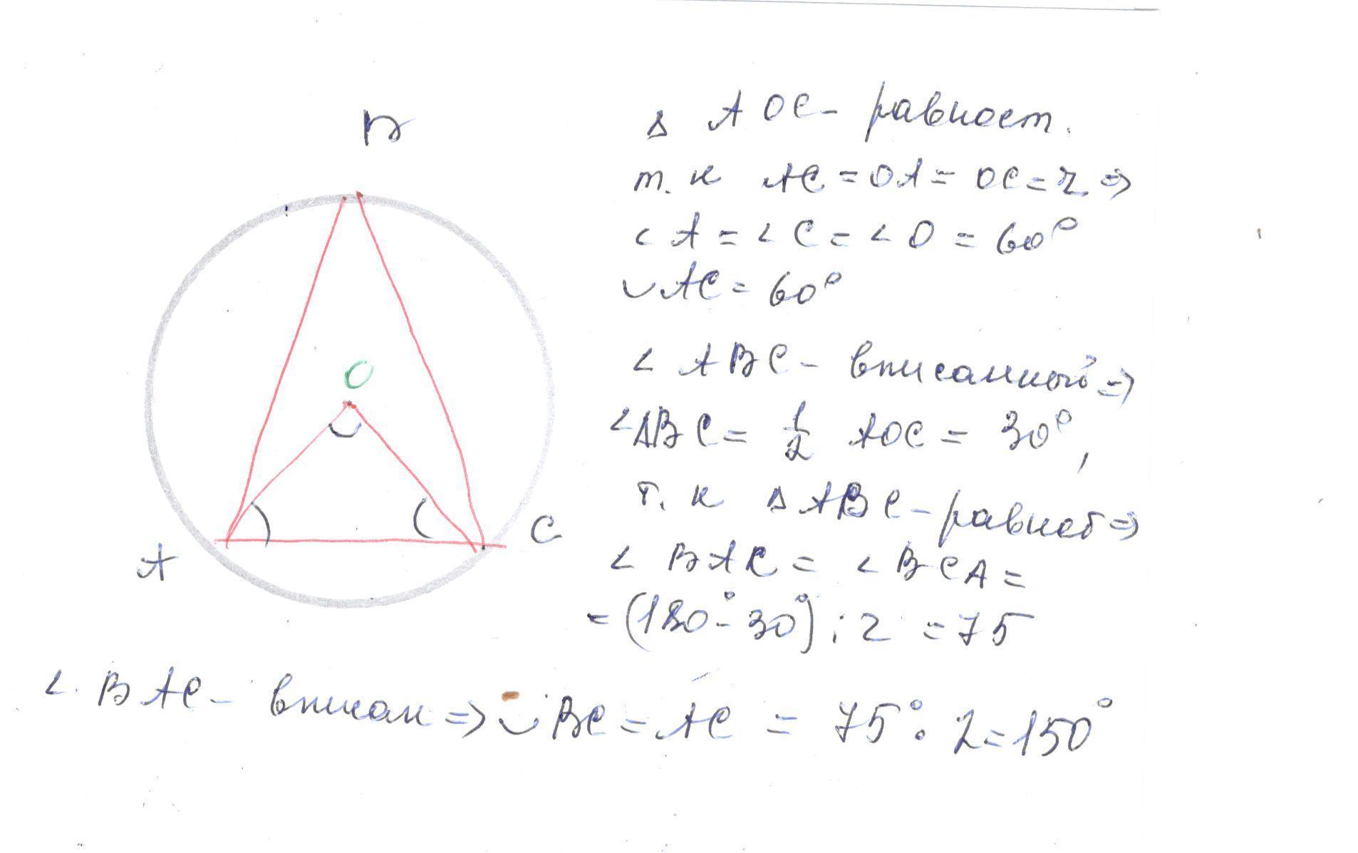 Равнобедренный треугольник АВСвписан в окружность. Основание треугольника АСравно радиусу окружности.Найдите величины дуг АС, АВи ВС