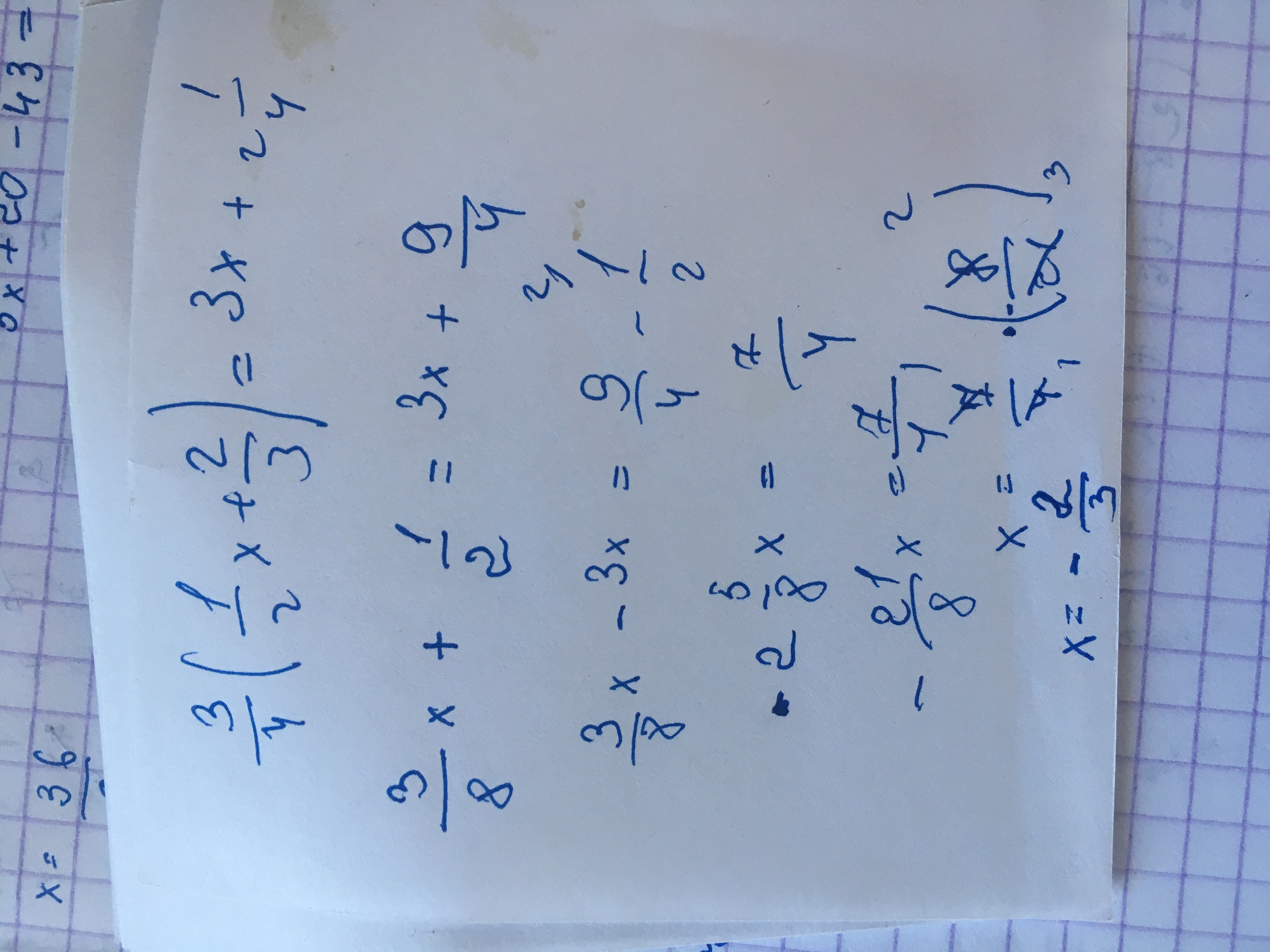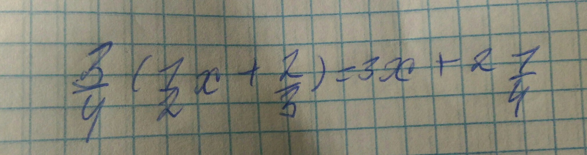 3/4*(1/2x+2/3)=3x+2целых 1/4 3/8x+2/4=3x+2целых 1/4 3/8x+3x=2целых1/4-2/4 3 целых3/8x=1целая 3/4 x=3/4:8/27 x=2/9