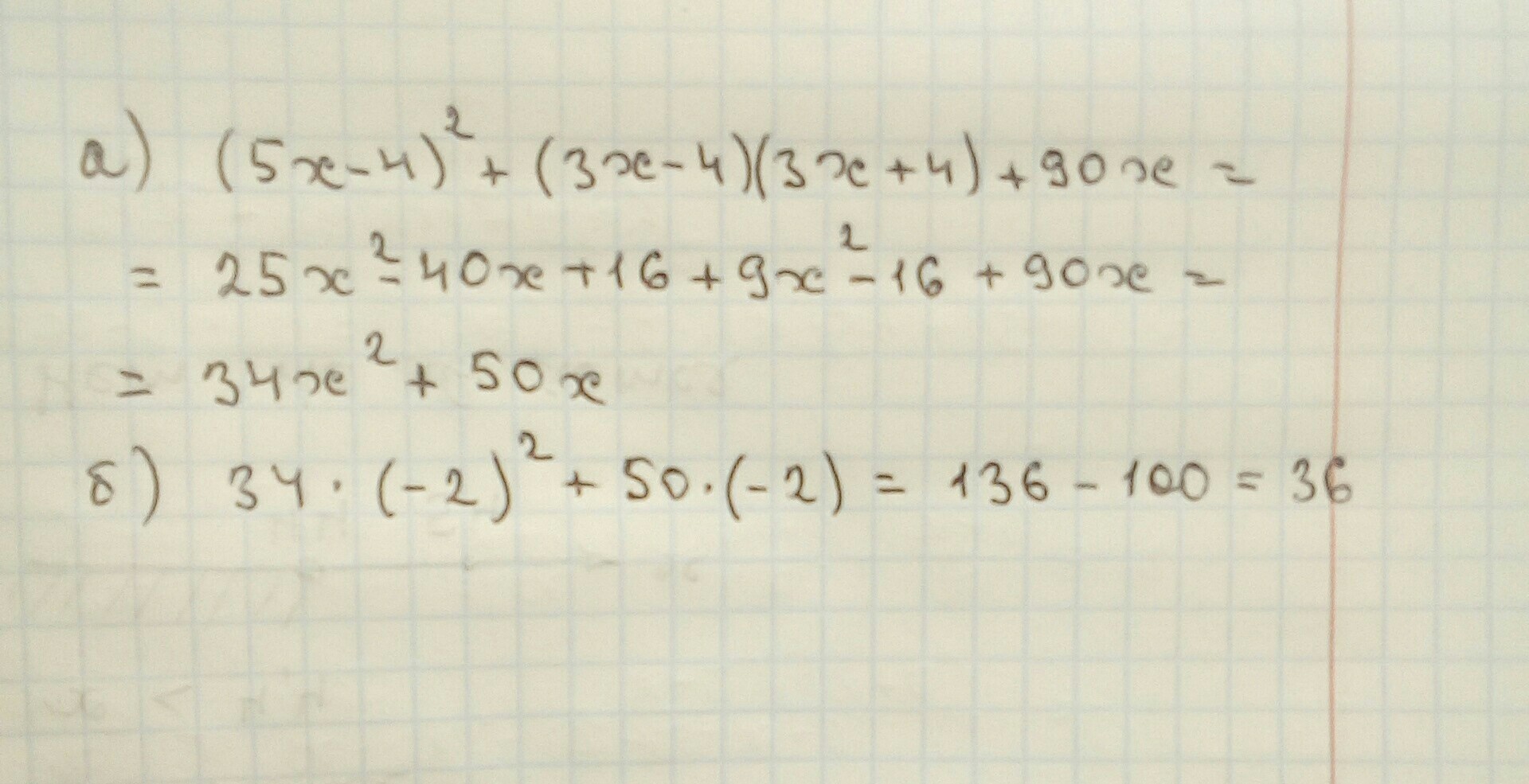 b) Покажите, что значение выражения(5x-4)^2+(3x-4)(3x+4)+90x при х= - 2 равно 36.
