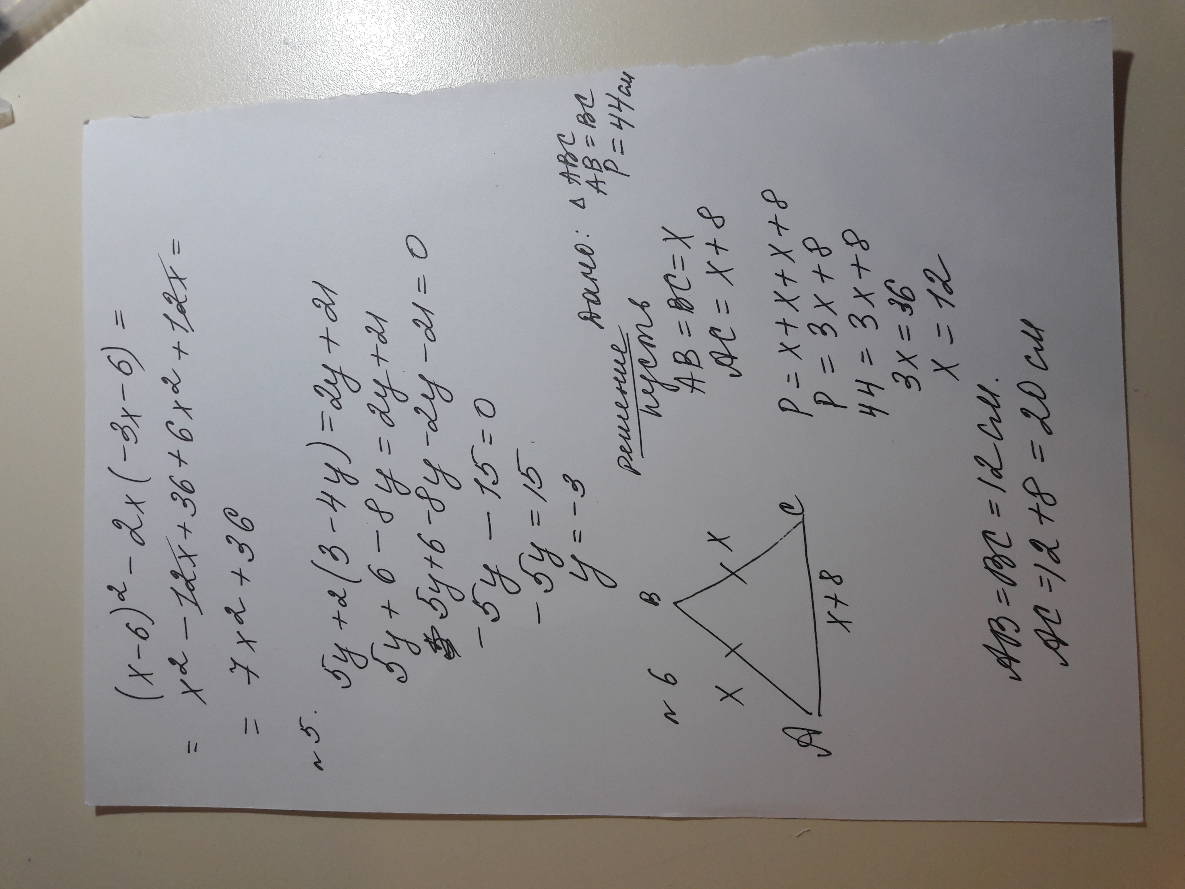 Упростите выражение(х-6)^2-2х(-3х-6). 5. Решите уравнение: 5у+2(3-4у)=2у+21 6. Боковая сторона равнобедренного треугтреугольника на 8 см меньше основания. Найдите стороны треугольника, если известен периметр треугольника 44 см.