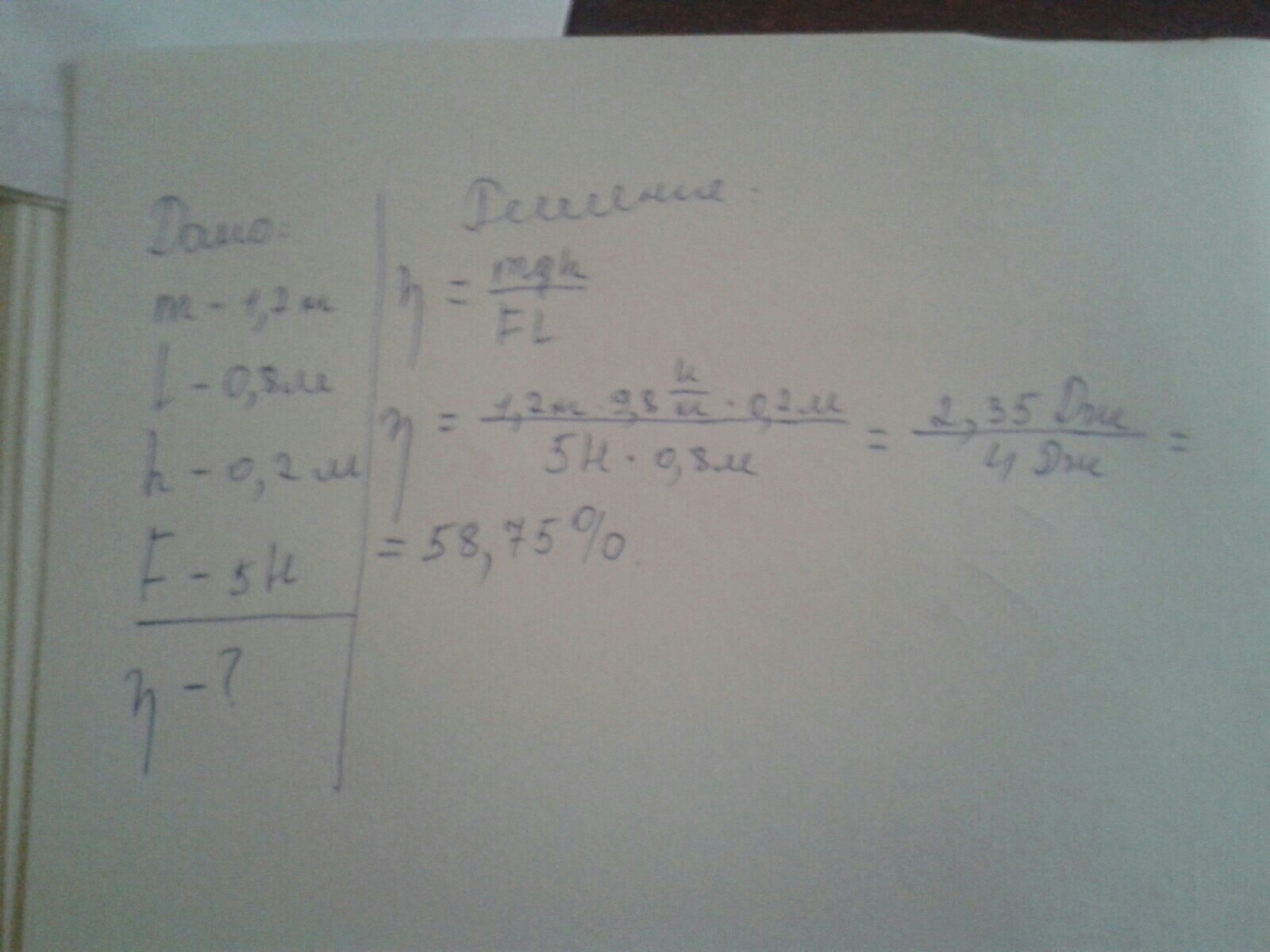 Груз масса которого 1.2кг, ученик равномерно переместил по наклонной плоскости длинной0,8 м на высоту0,2 м. При этом перемещении сила, направленная параллельно наклонной плоскости, была равна 5 Н. Какой результат должен получить ученик при вычислении КПД установки?