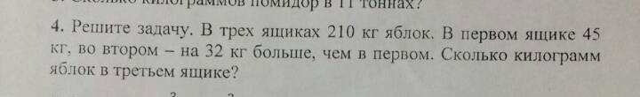 1)45+32=77(кг) яблок в 2 ящике2)77+45=122(кг) яблок в 1 и 2 ящике3)210-122=98(кг) яблок в 3 ящикеОтвет:в 3 ящике 98кг яблок
