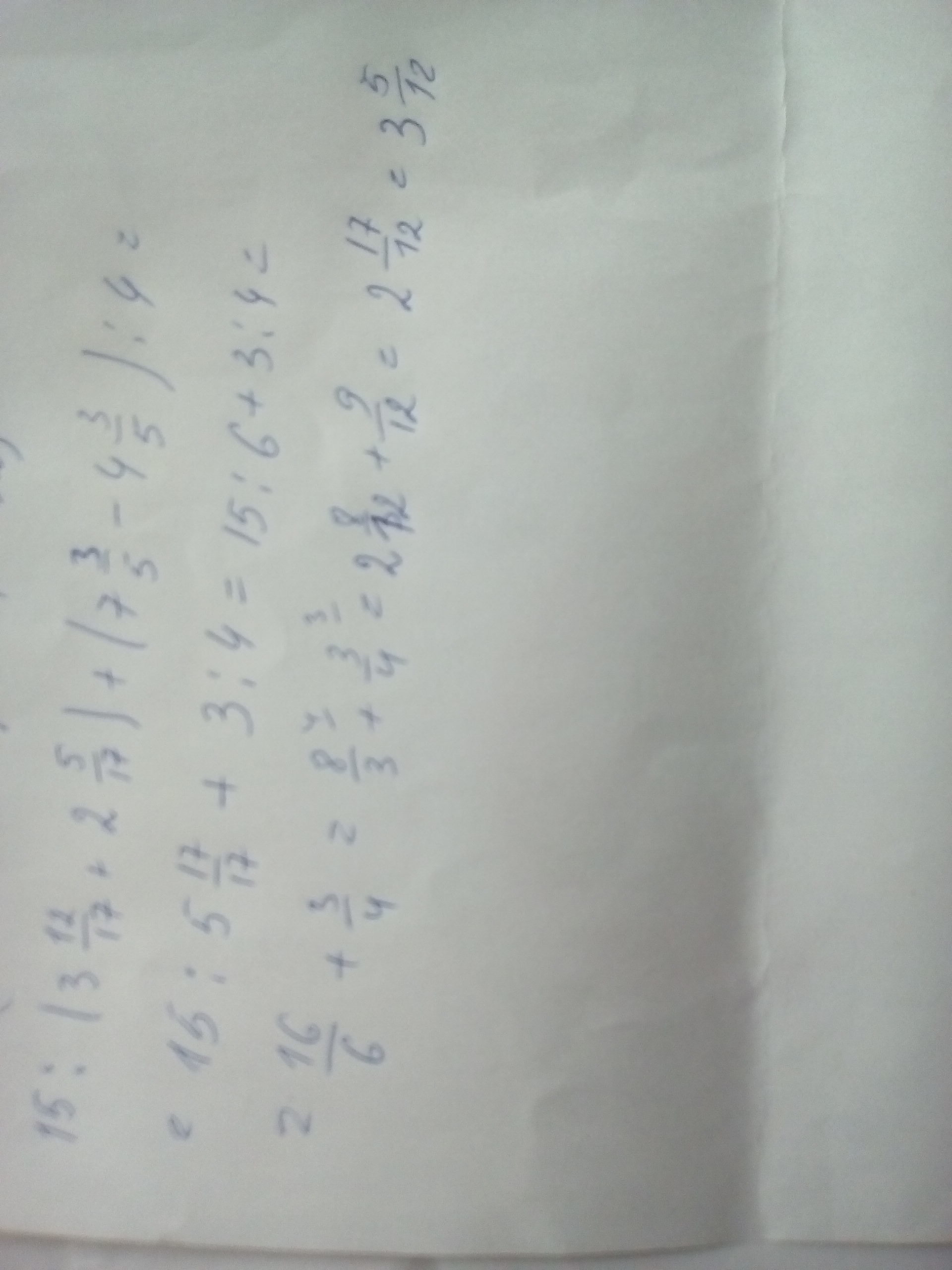 15: (3 двенадцать семнадцатых + 2 пять семнадцатых)+(7 три пятых - 4 три пятых) : 4 =