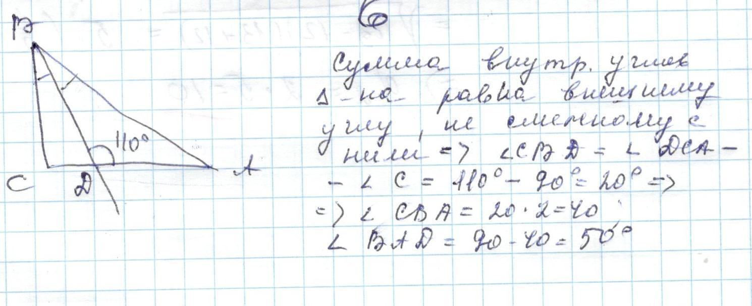 дано треугольник ABC угол C прямой проведена биссектриса BD угол D равен 110 градусов найти угол BAD