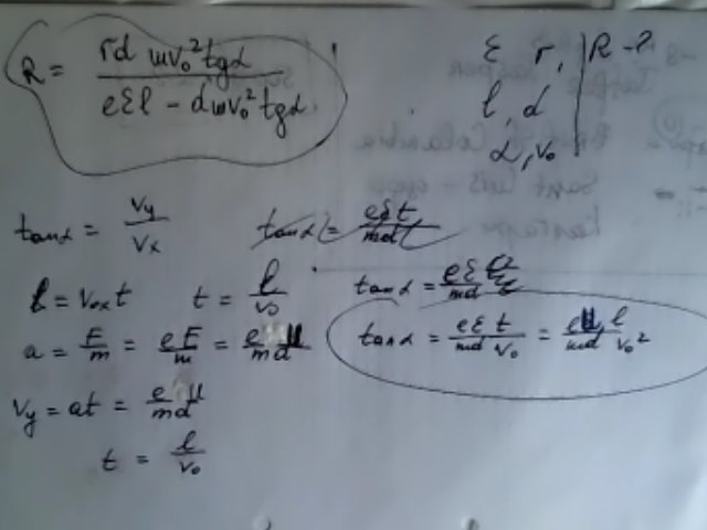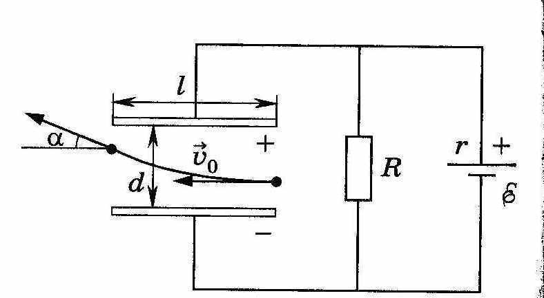 Пучок электронов влетает в конденсатор параллельно его пластинам со скоростью v0.Конденсатор включен в цепь, как показано на рисунке. ЭДС источника тока E, его внутреннее сопротивление r, длина пластин конденсатора l и расстояние между ними d. Какое сопротивление R должно быть у резистора, подсоединенного параллельно конденсатору, чтобы пучок электронов вылетал под углом a к пластинам?