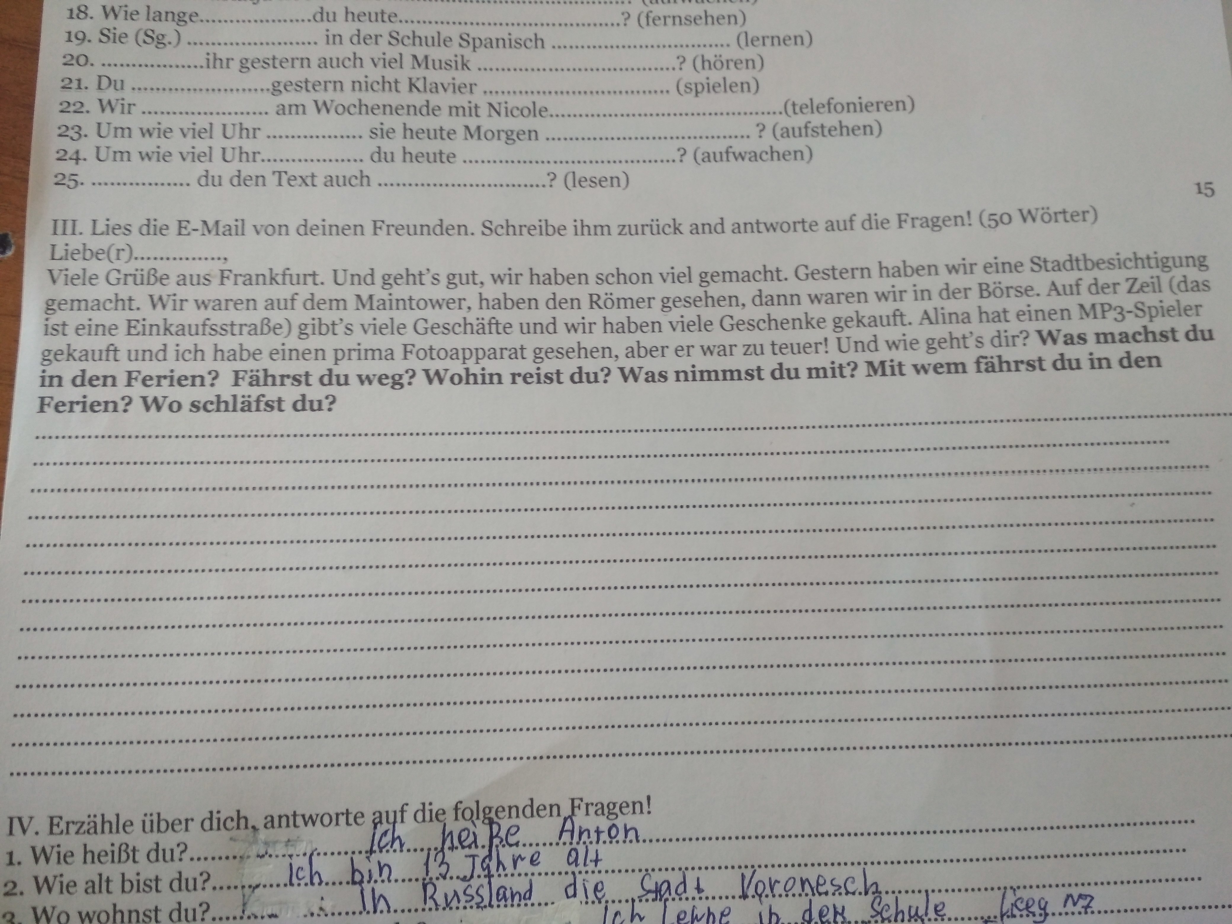Viele Grüße aus Woronesch. Mir geht es auch gut. In den Ferien fahre ich auch weg. Ich reise nach Italien. Ich fliege zum ersten Mal mit dem Flugzeug. Ich möchte schwimmen, chillen und Rom besichtigen. Ich nehme meinen Koffer mit den T-Shorts und Kurzhosen, einer Badehose, einer Kappe, einer Sonnenbrille mit. Ich bin 13, und ich fahre mit den Eltern. Wir übernachten in einem Hotel. Tschüs! Anton.