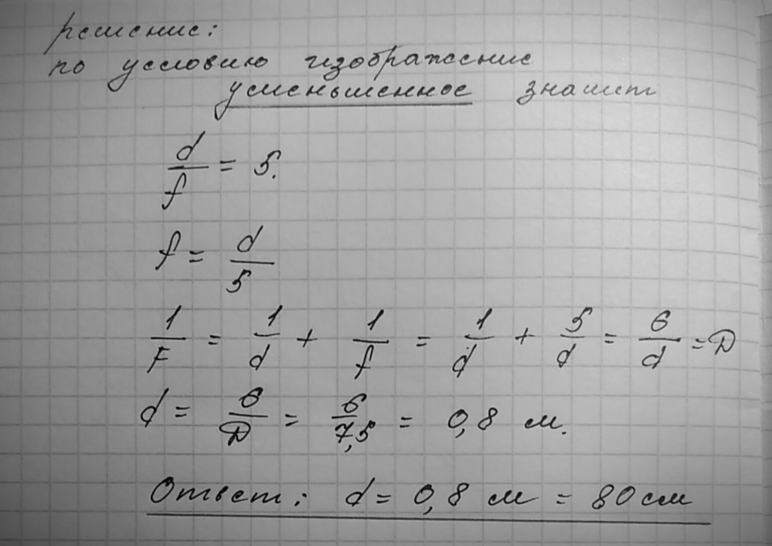 ДАЮ 30 БАЛЛОВ ///Тонкая линза с оптической силой D=7,5 дптр дает изображение предмета на экране ,уменьшенное а 5 раз . Определите расстояние от предмета до линзы. Если можно ,то с построением .Решить как- то по подобию треугольников в рисунке.