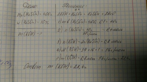 Расщитайте массу гидроксида калия необходимого для полной нейтролизации 400 г серный кислоты с массовой долей H2SO4 10%