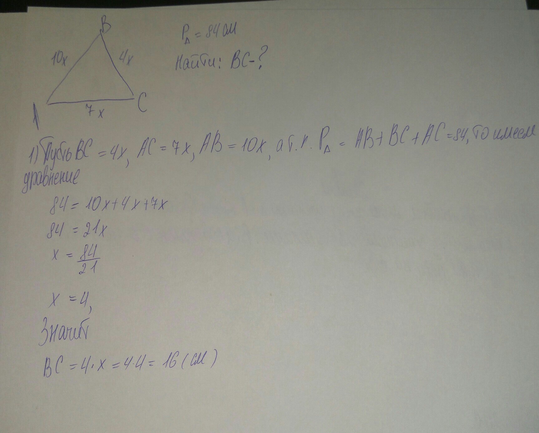1) Стороны треугольника относятся как 4: 7: 10 , а его периметр равен 84 см Найдите меньшую сторону треугольника.