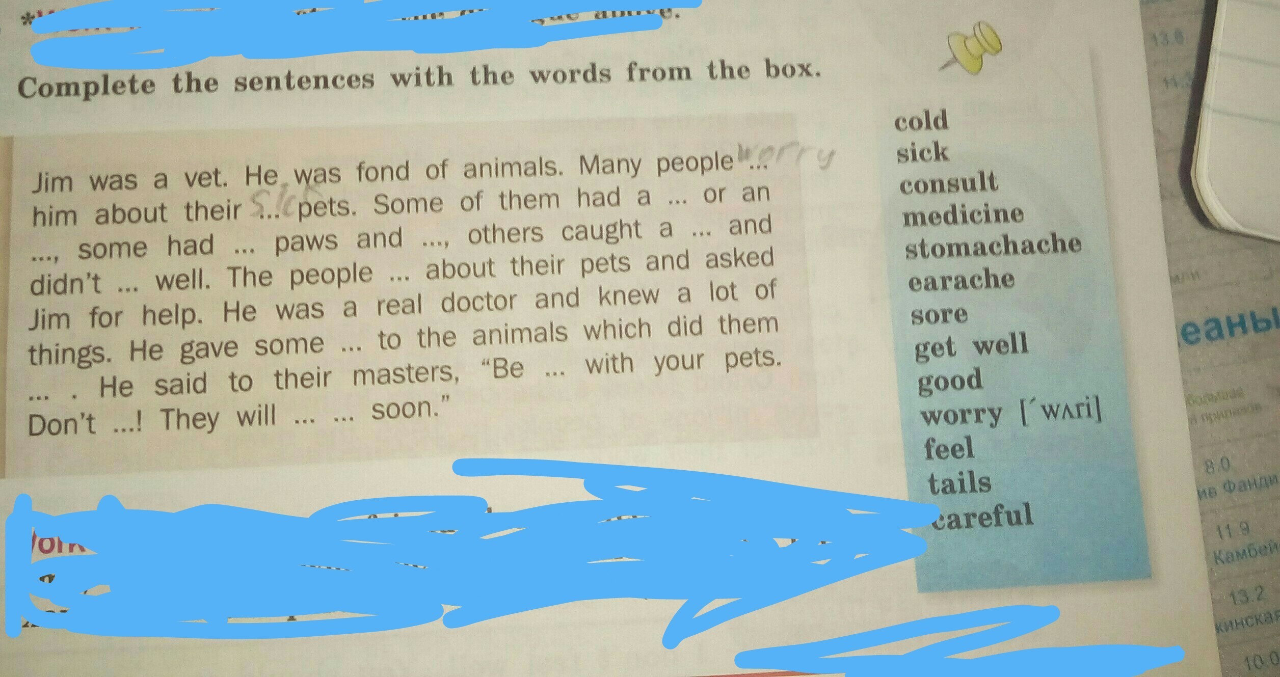 Jim was a vet. He was fond of animals. Many people consulted him about their sick pets. Some of them had a stomachache or an earache, some had sore paws and tails, others caught a cold and didn't feel well. The people worried about their pets and asked Jim for help. He was a real doctor and new a lot of things. He gave some medicine to the animals which did them good. He said to their masters, "Be careful with your pets. Don't worry! They will get well soon."