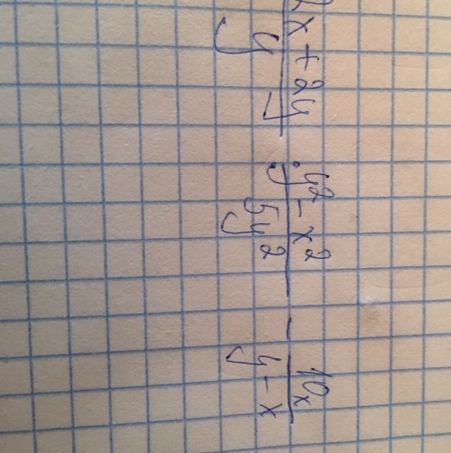 frac{2x + 2y}{y}  div  frac{ {y}^{2 }  -  {x}^{2} }{ {5y}^{2}  }  -  frac{10x}{y - x}  =  \  frac{2(x + y)}{y}  times   frac{5 {y}^{2} }{(y - x)(y + x)}  =
