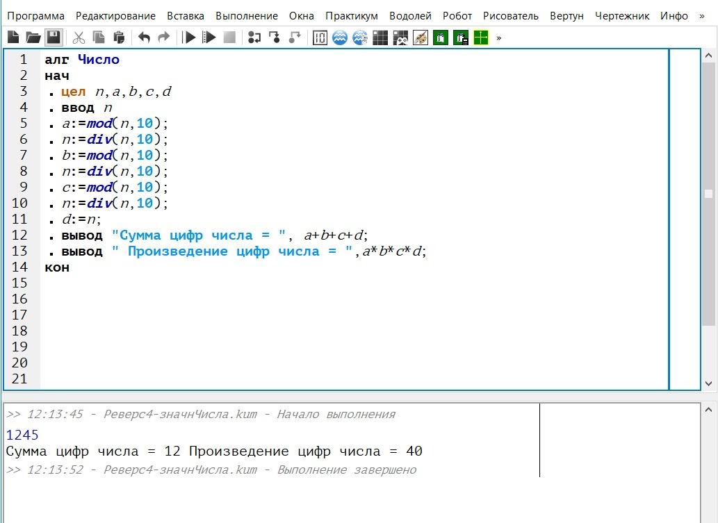 Составьте программу, которая подсчитывает сумму и произведение цифр введенного четырёхзначного числа.