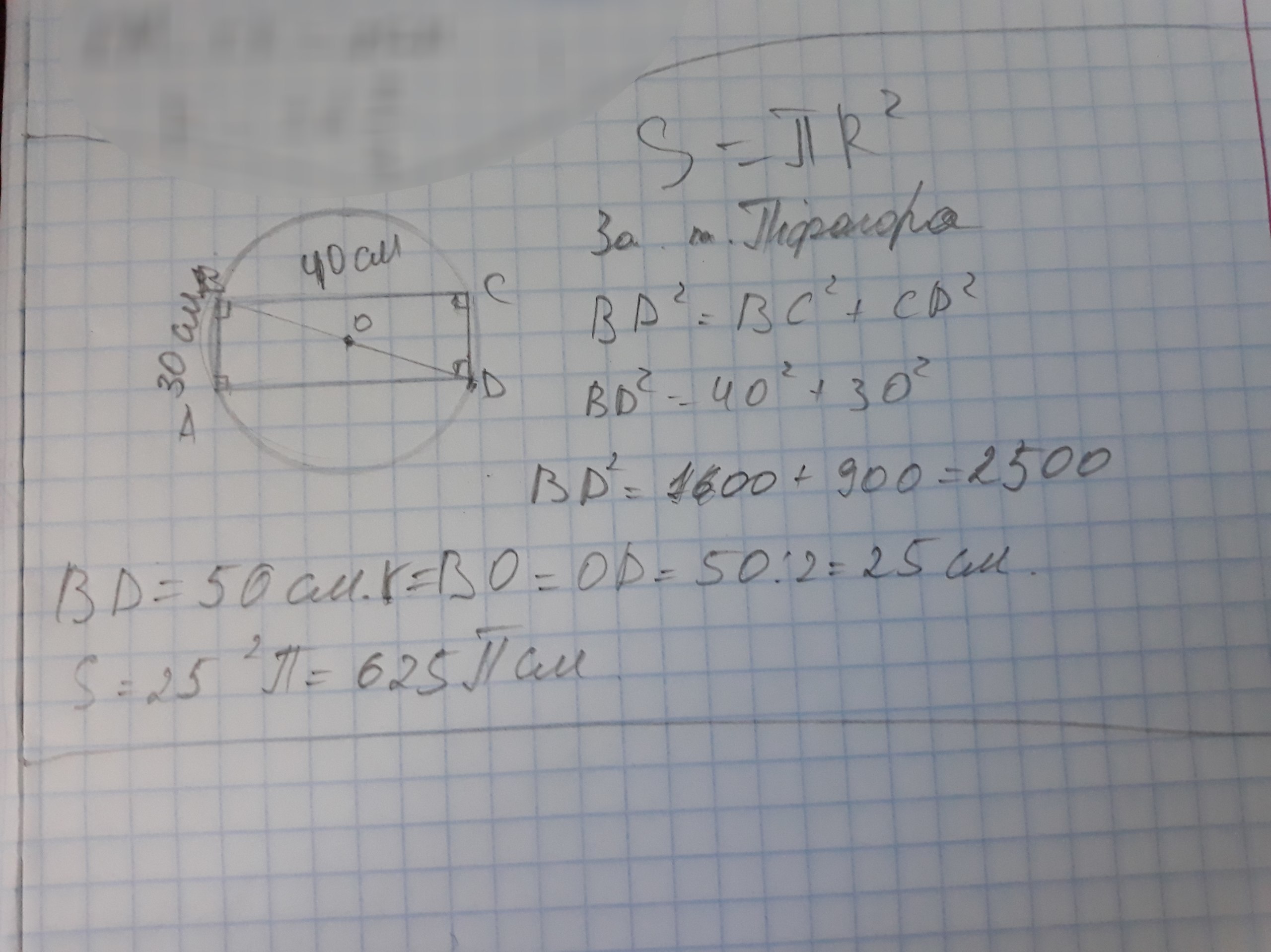 Сторони прямокутника дорівнюють 40 і 30 см.Знайдіть площу круга описаного навколо цього прямокутника