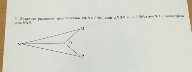 угол МНО= углу ОНП тк НО биссектрисса.НО- общая; они равны по второму признаку- Если сторона и прилежащие к ней углы одного треугольника равны соответственно стороне и прилежащим к ней углам другого треугольника, то такие треугольники равны.