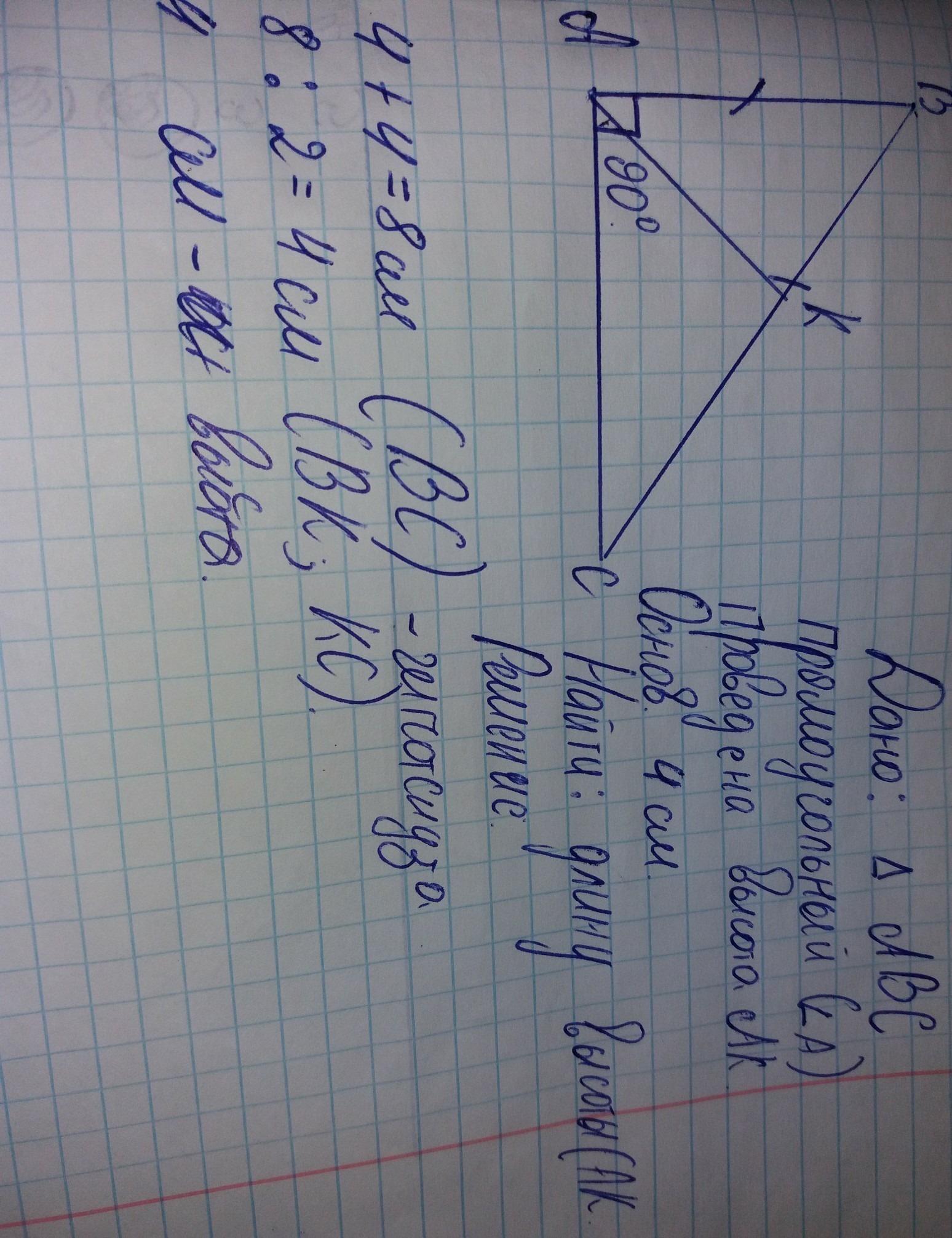 В прямоугольном равнабедренном треугольнике АВС с прямым углом А проведена высота АК.Найдиье длину высоты если основания треугольника СВ равна 4 см. помогите пж