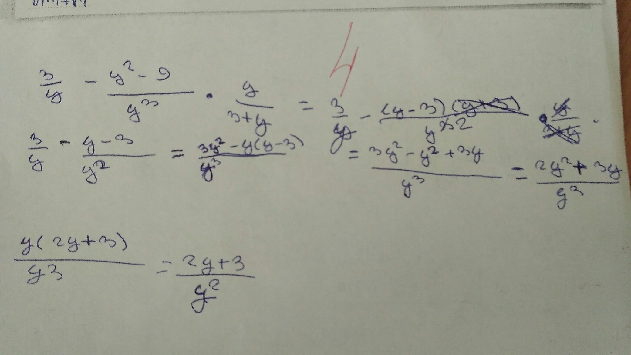 (3/y) - ((y-3)(y+3)/y^3)*(y/(y+3)) = (3/y) - (y -3)/y^2 = (3y - y + 3)/y^2 = (2y + 3)/y^2