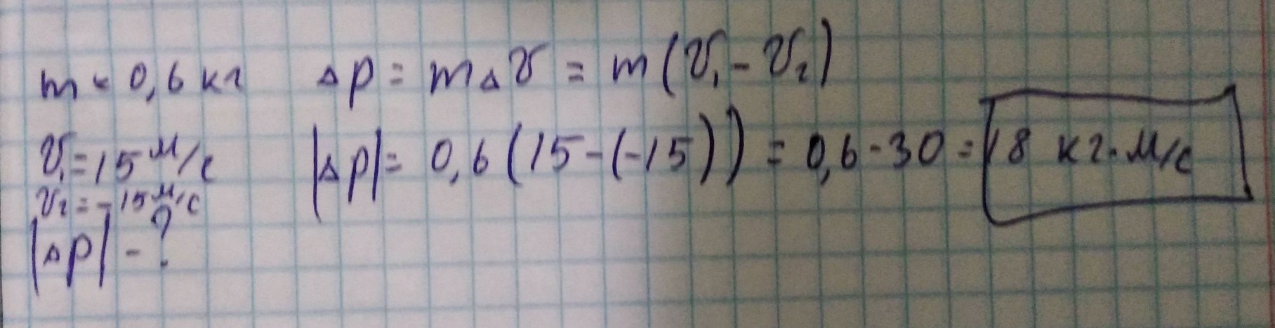 мяч массой 0,6 кг движущийся со скоростью 15 м/с , после удара о стенку движется в противоположном направлении с той же по модулю скоростью. Определите модуль импульса мяча после удара об стенку