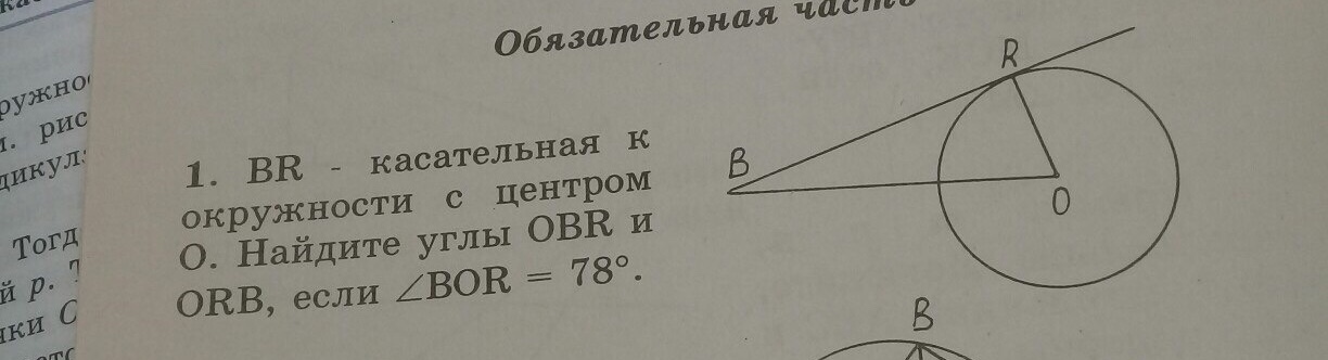 Треугольник ОBR прямоугольный, так как радиус OR, проведенный в точку касания, перпендикулярен касательной (свойство). Следовательно, <ORB=90°, а <OBR = 90° - 78° = 12° (так как сумма острых углов прямоугольного треугольника равна 90°)