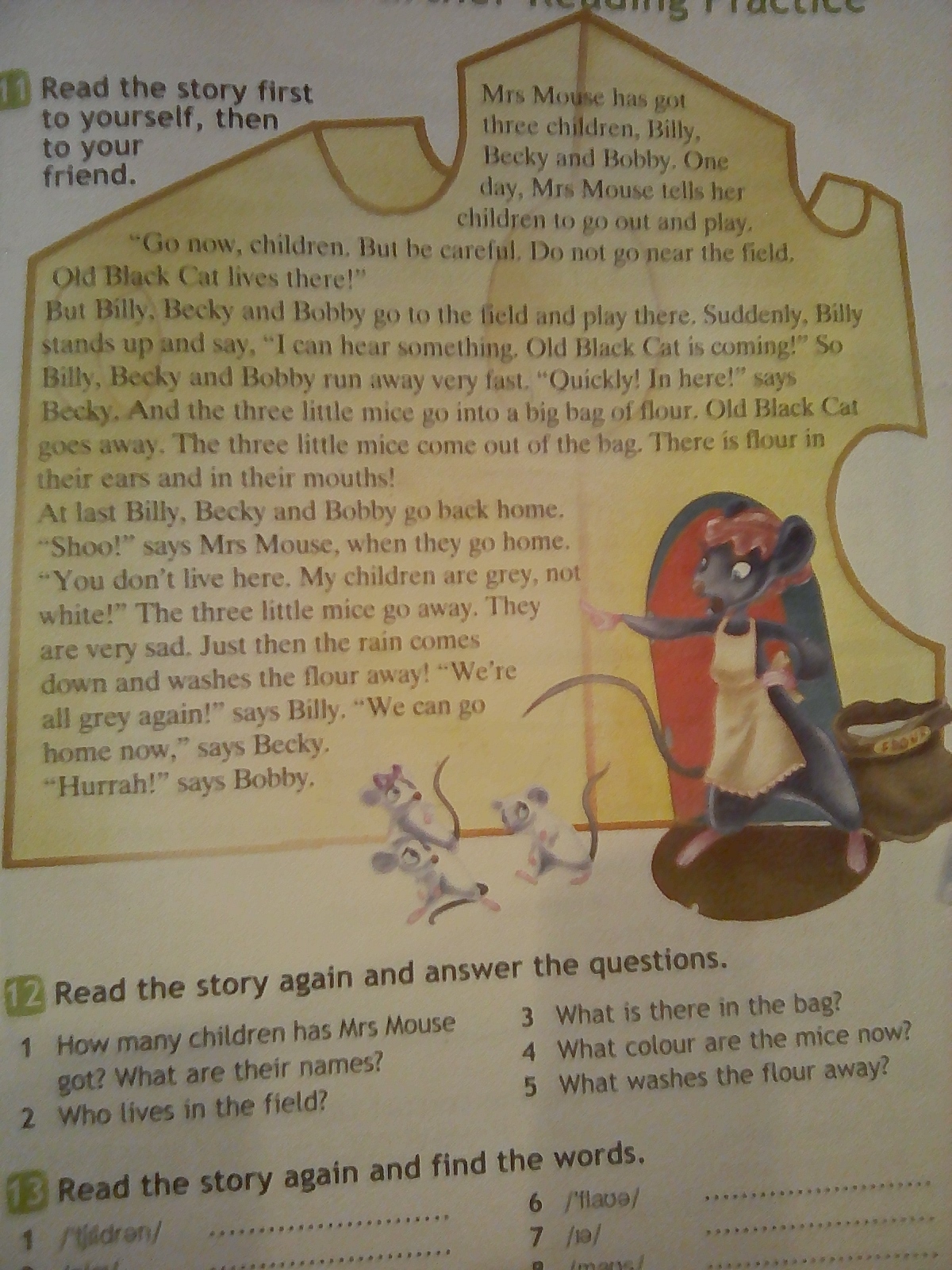 У миссис М. есть трое детей, Билли, Бекки и Бобби. Однажды миссис Маус говорит своим детям, чтобы они вышли и сыграли «Иди, дети, но будьте осторожны, не ходите рядом с полем. " Но Билли. Бекки и Бобби идут на поле и играют там. Внезапно Билли встает и говорит: «Я слышу, что что-то старое Elack Cat идет», так Билли. Бекки и Бобби сбежали очень быстро. «Быстро! В ерети», - говорит Бекки. И три маленьких мыши вошли в большую сумку. Старый Черный Кот уходит. Три маленьких мыши вышли из сумки. В их ушах и в устах есть нос! Наконец Билли, Бекки и Бобби возвращаются домой. «Кыш!» - говорит миссис Маус, когда они идут домой. «Вы здесь не живете. Мои дети серые, а не белые!» Три маленьких мыши уходят. Они очень грустны. В это время дождь спускается и смывает муку! Мы снова серой серой, - говорит Билли, - теперь мы можем вернуться домой, - говорит Бекки, - сказал Урай Бобби.