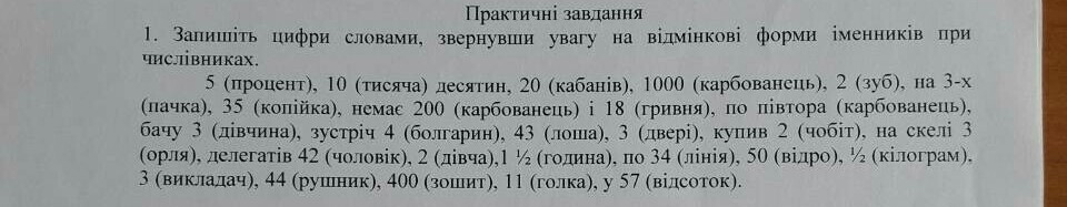 п'ять процентів, десять десятин, двадцять кабанів, тисяча карбованців, два зуба, на трьох пачка, тридцять п'ять копійок, немає двохсот кабованців і вісімнадцять гривень, по півтора карбованця, бачу три дівчини, зустріч чотирьох болгаринів, сорок три лоша*(не совсем уверен), три двері, купив двоє чобіт, на скелі три орла, делегатів сорок два чоловіка, дві дівчини, по тридцять четвертій линиї, п'ятдесят відер, півкілограма, три викладача, сорок чотири рушники, чотириста зошитів, одинадцять голок, у п'ятдесят сім відсотків