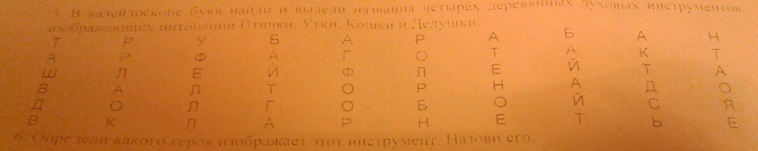 В калейдоскопе букв найди и выделить названия четырёх деревянных духовых инструментов, изображающих интонации: птички,утки, кошки и дедушки)