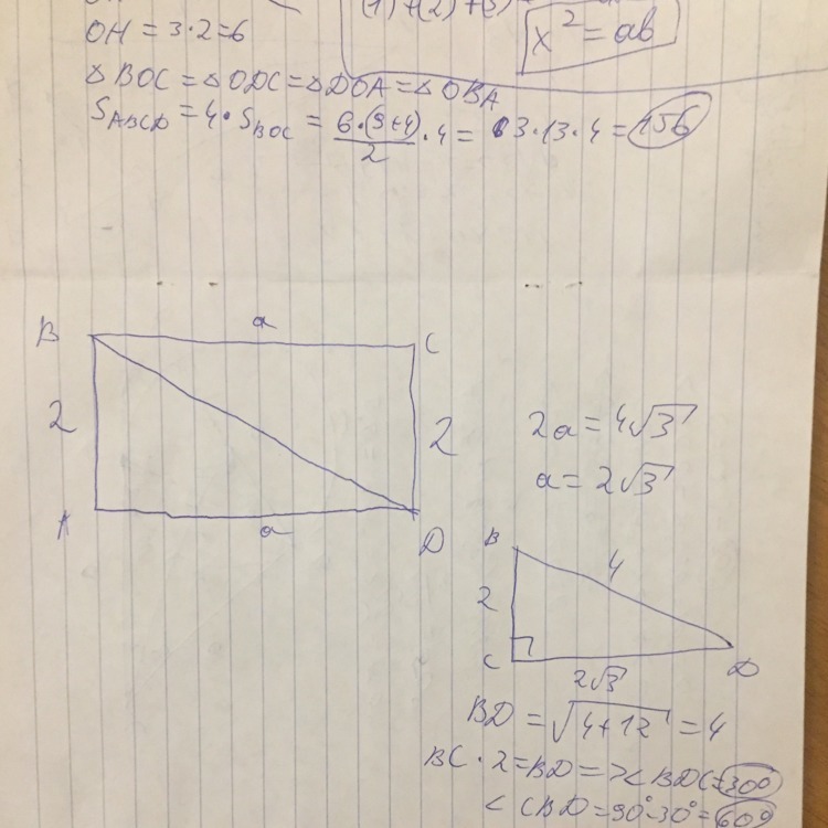Длинна сторон CG прямоугольника ABCD=2см вычислите градусные меры углов треугольника BCD если известно что площадь прямоугольника 4корень3(Можно пожалуйста с решением и рисунком)