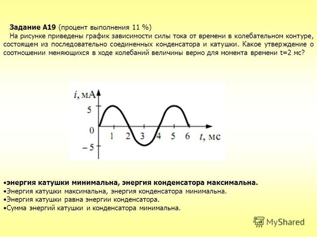 Ответ: Энергия катушки минимальна, энергия конденсатора максимальна.
