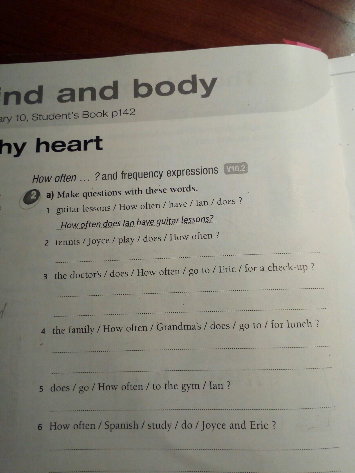 2)How often does play tennis Joyce?3)How often does Eric go to the doctor's for a check-up?4)How often does the family go to Gtandma's for lunch5)How often does Ian go to the gym6)How often do Joyce and Eric study Spanish?
