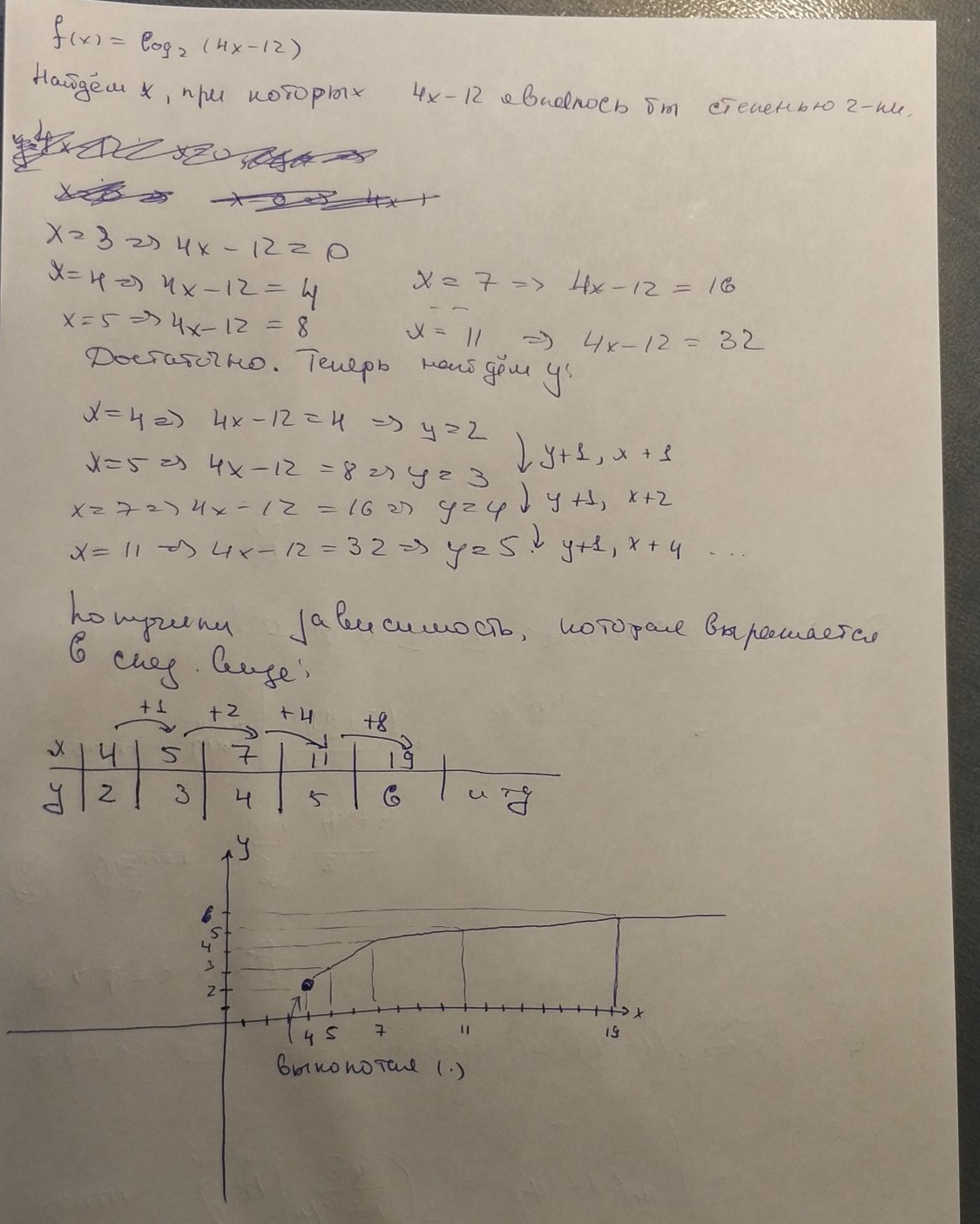 Мы выяснили, по какому принципу изменяются x и y в логарифмической фукнции. Таким образом, мы выстроили набор координат, забыли про логарифм и построили график.