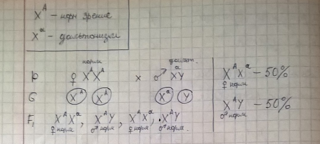 Ген дальтонизма сцеплен с Х-хромосомой. Отец болен дальтонизмом, мать здорова и не является носительницей. Укажите генотипы и фенотипы детей, составив схему скрещивания.