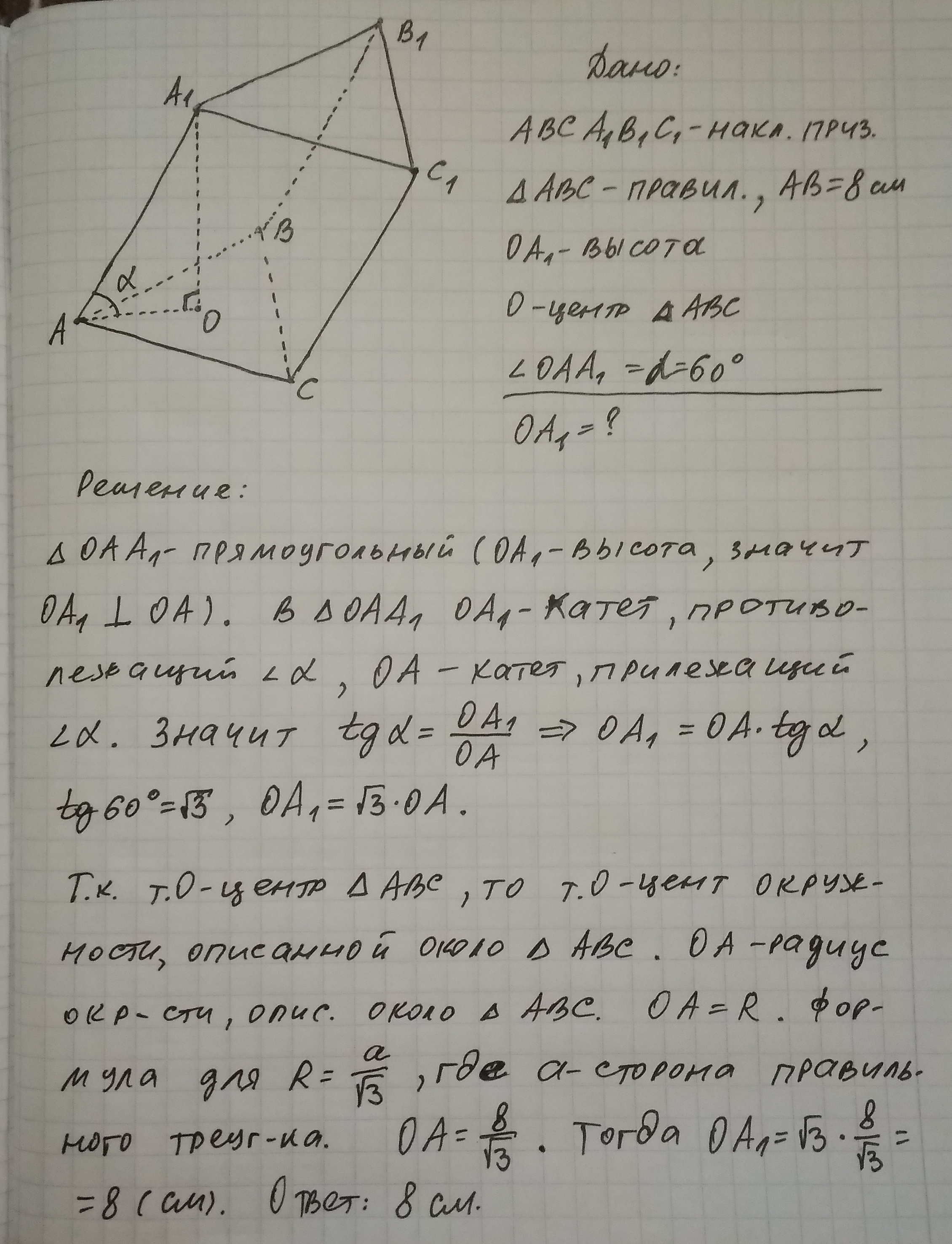 В основе наклонной призмы лежит правильный треугольник со стороной 8 см. одна из вершин верхнего основания проектируется в центр нижнего основания, а боковое ребро образует с плоскостью основания угол 60.Найти высоту
