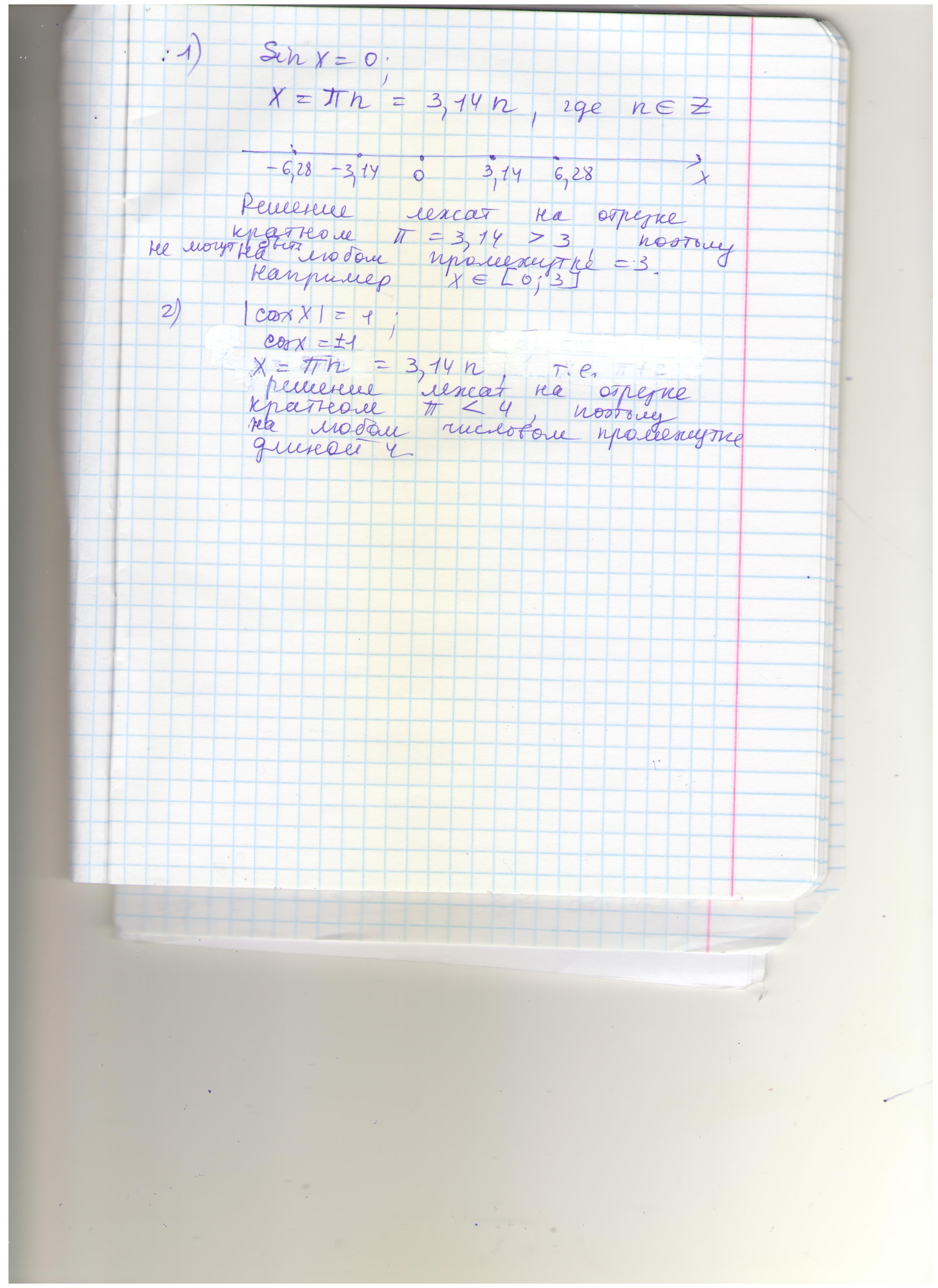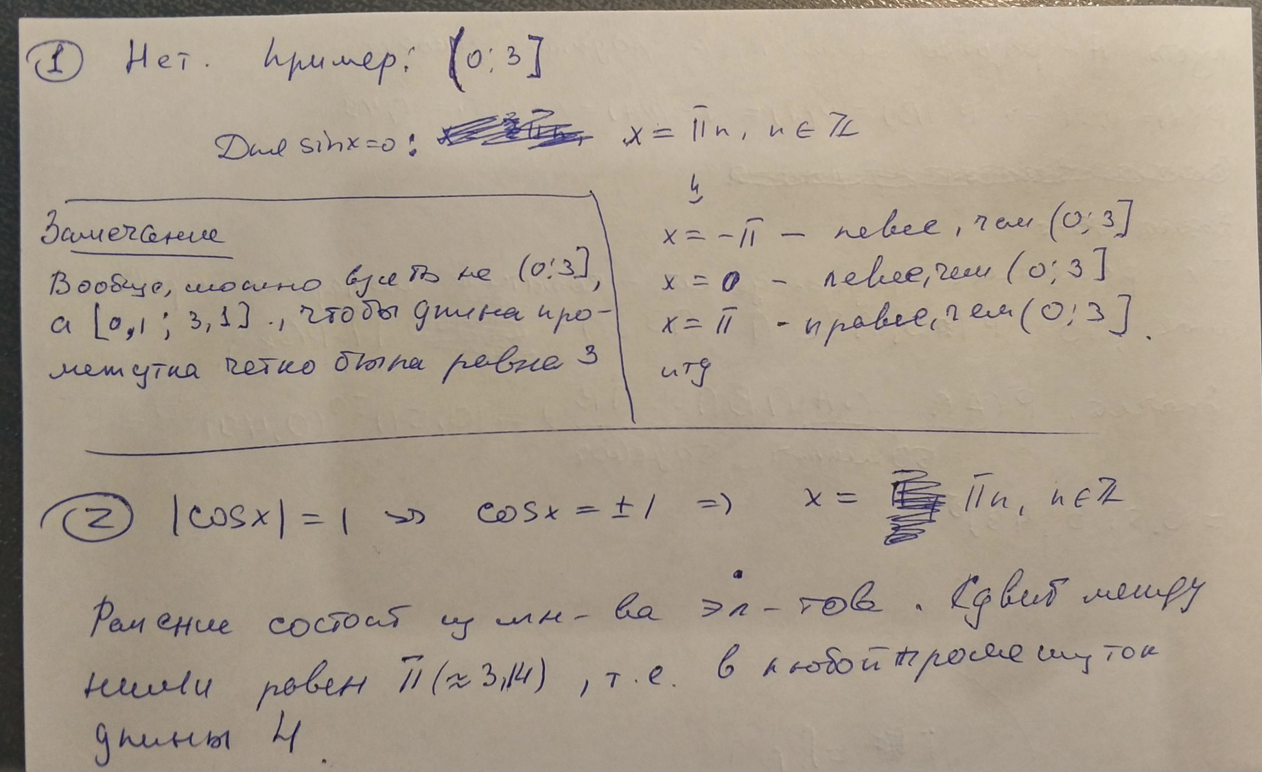 1) Верно ли, что уравнение sin x = 0 имеет решения на любом числовом промежутке длиной 3? Если да, то объясните почему. Если нет, то приведите пример.