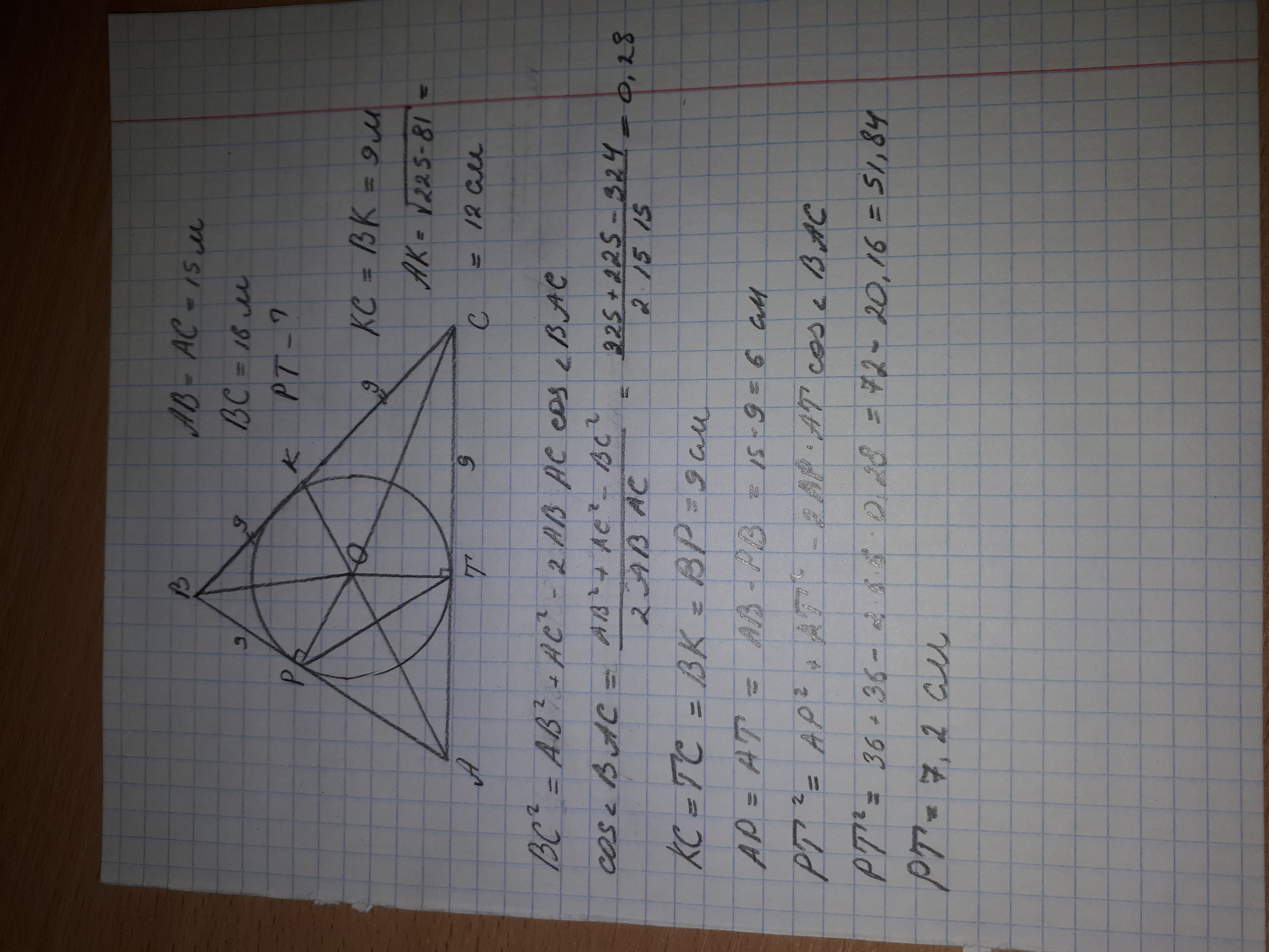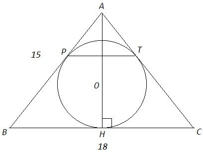 Окружность вписанная в треугольник ABC, касается сторон AB и AC в точках P и T соответственно. Найдите PT, если AB=AC=15м, BC = 18м.