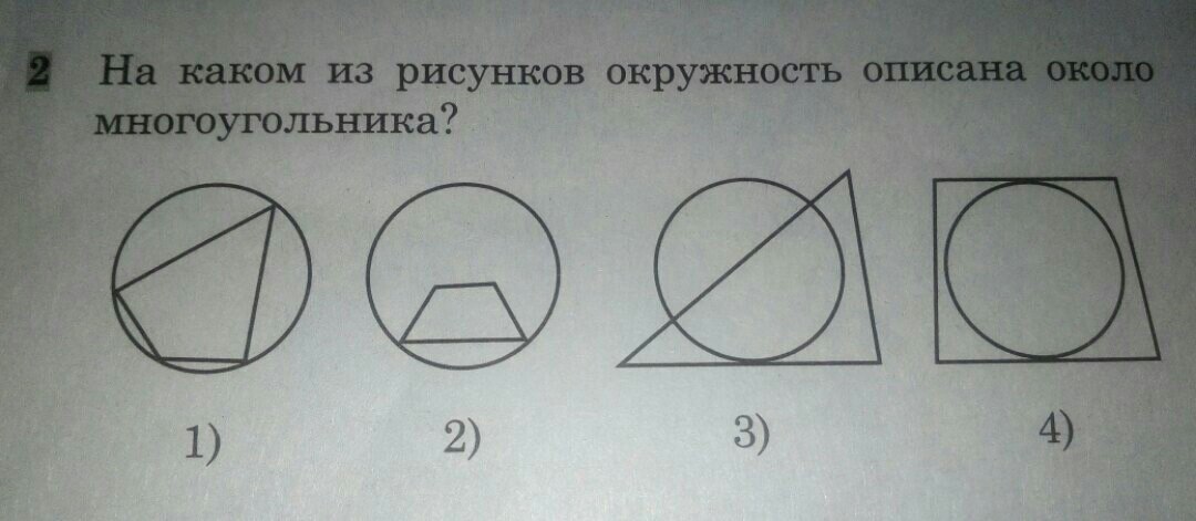 На первом. Окружность описана около многоугольника - значит она проходит через все его вершины.