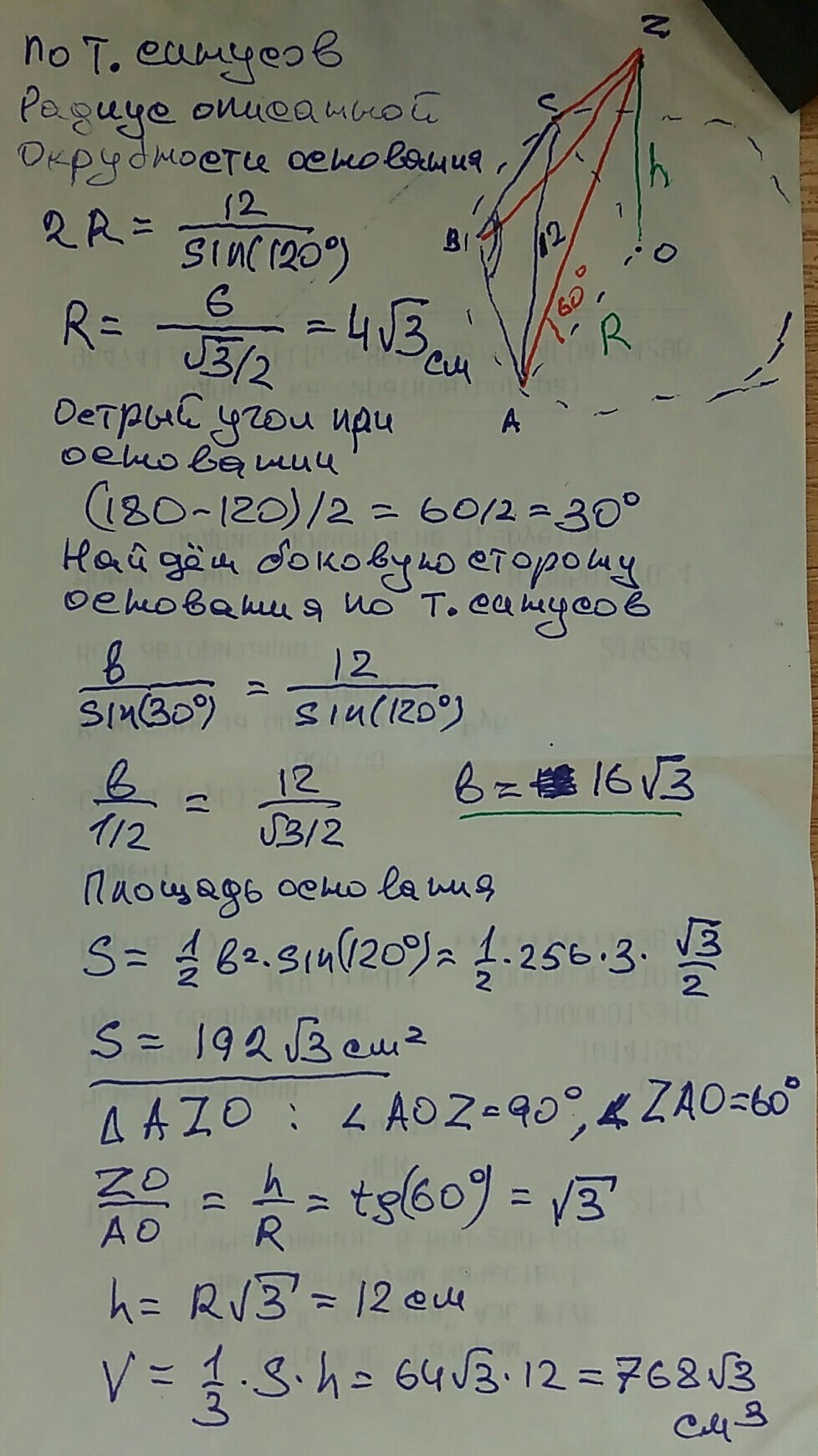 В основании пирамиды лежит равнобедренный треугольник с основанием 12 см и углом при вершине 120° все боковые ребра пирамиды образуют с высотой угол 60° Найти обьем пирамиды.
