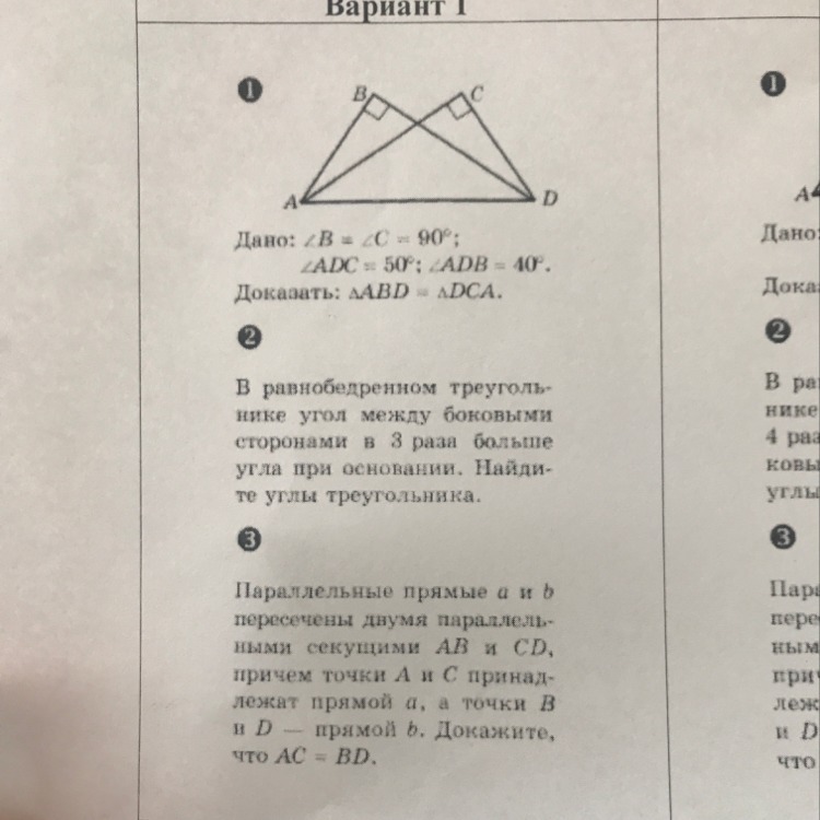 В треугольнике ADC против гипотенузы AC лежит угол ADC= 50 градусам. Значит, угол DAC =90(сумма острых углов в прямоугольном треугольнике)-угол ADC=90-50=40 градусов. Угол DAC лежит против меньшего катета, как и угол ADB в треугольнике ABD. AD-общая гипотенуза,так, треугольник ADC=треугольнику ABD по гипотенузе и острому углу .